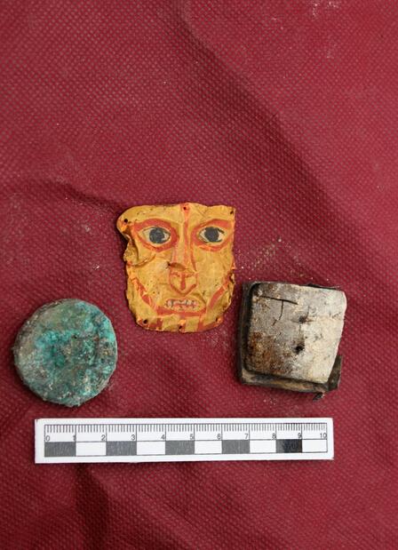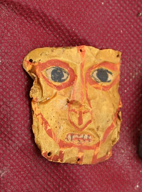 Photo shows a golden mask unearthed in Tibet. The eyes, nose and mouth were drawn on with black and red pigment. The golden mask is key to studying Zhangzhung civilization. Records show the Zhangzhung Kingdom ruled the western region of today's Tibet before it was conquered by the Tubo Kingdom. (Photo/CCTV)