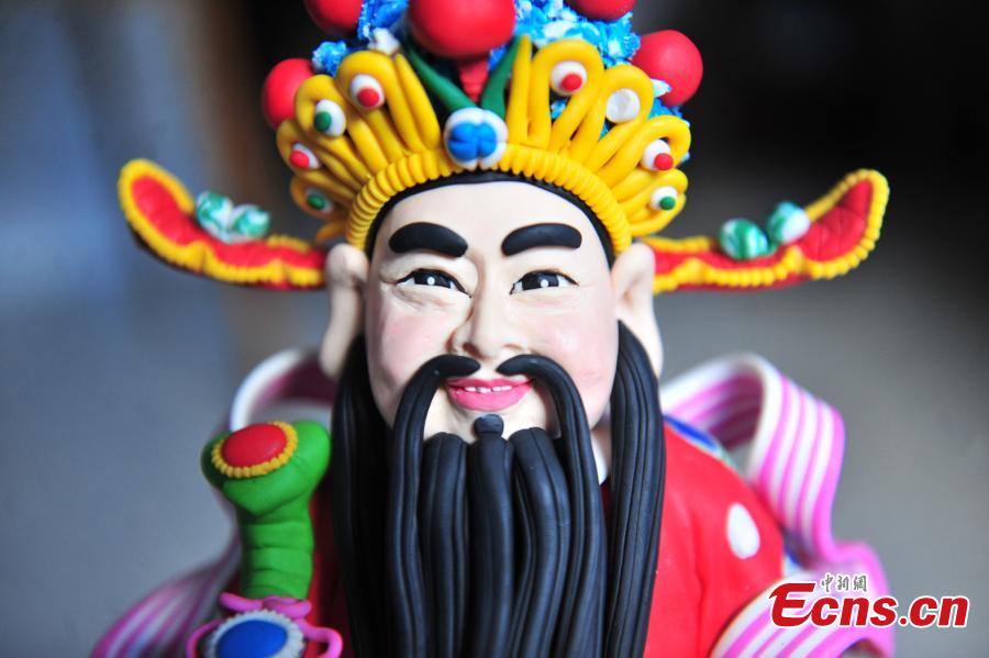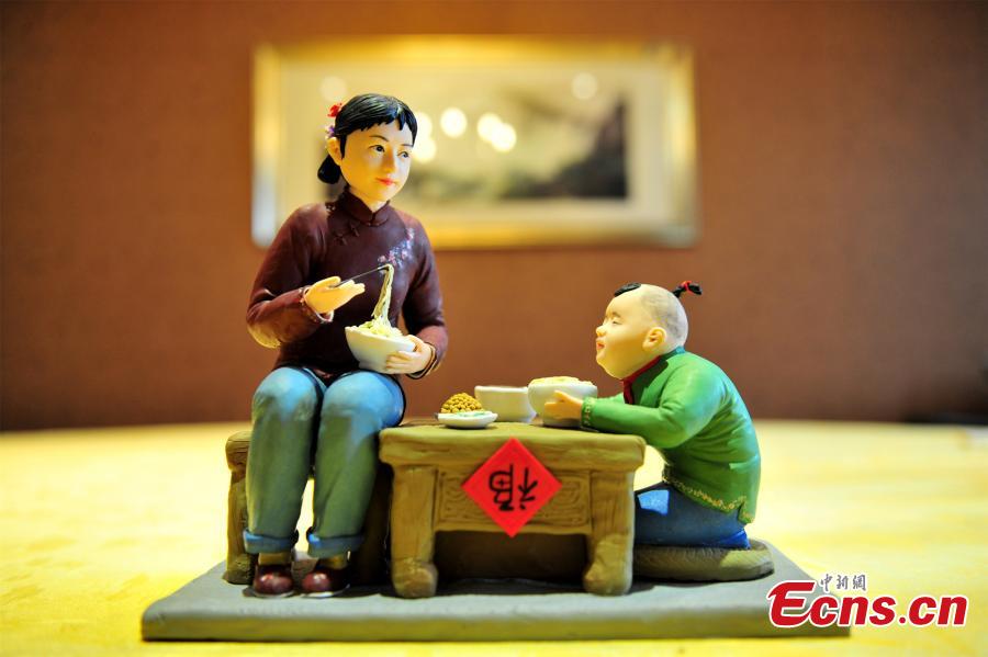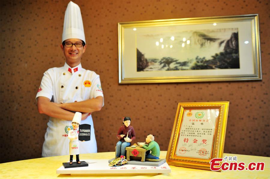 Ai Min, a cook, poses with dough figurines and a certificate of awards in Yichang, Hubei province on September 22, 2015. Ai has learned the craft since 2012 and made more than 2,000 pieces of art works. (Photo: China News Service/Zhang Guorong)