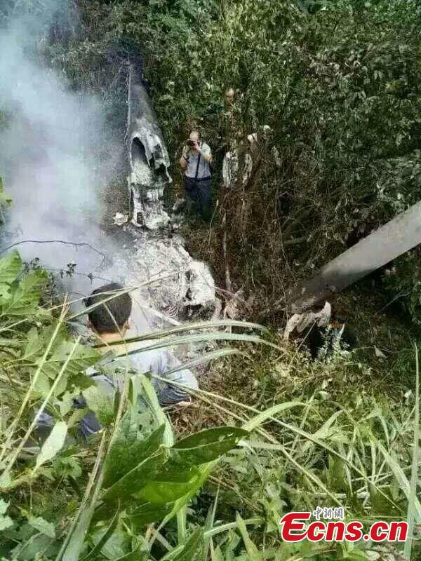 Two people were killed in a helicopter crash in a mountain in southwest China's Guangxi Zhuang Autonomous Region on the morning of Sept. 21, 2015. The crashed helicopter belongs to Hubei Tongcheng General Aviation Company and it was used for aero geophysical exploration. It lost contact with the ground when it was about to undertake aero geophysical exploration. (CNS photo/Zhong Xin)