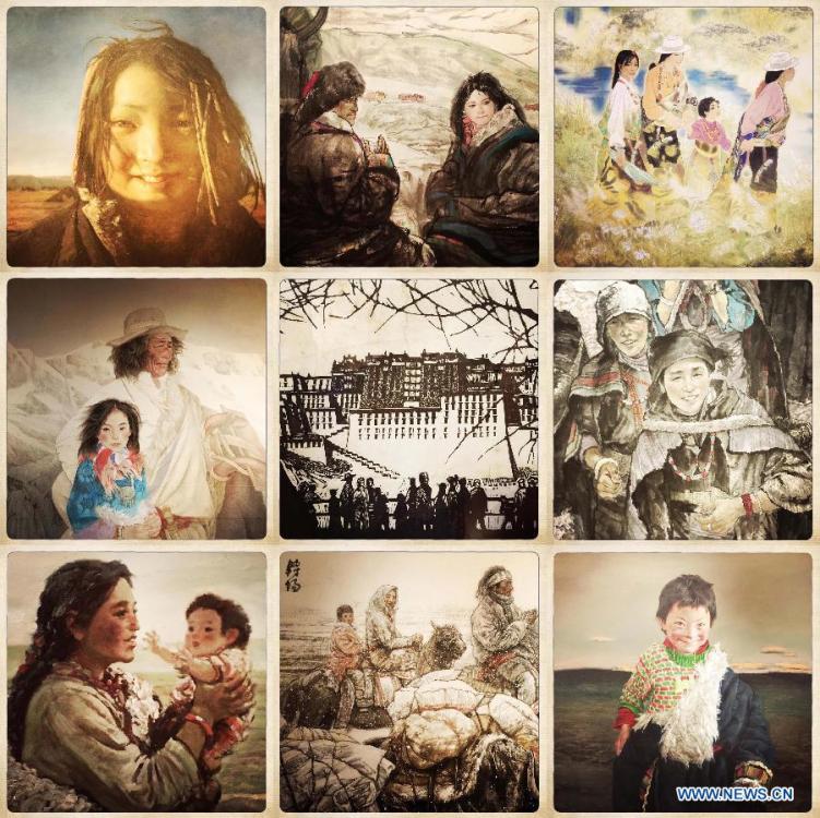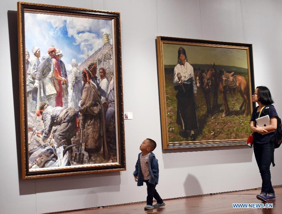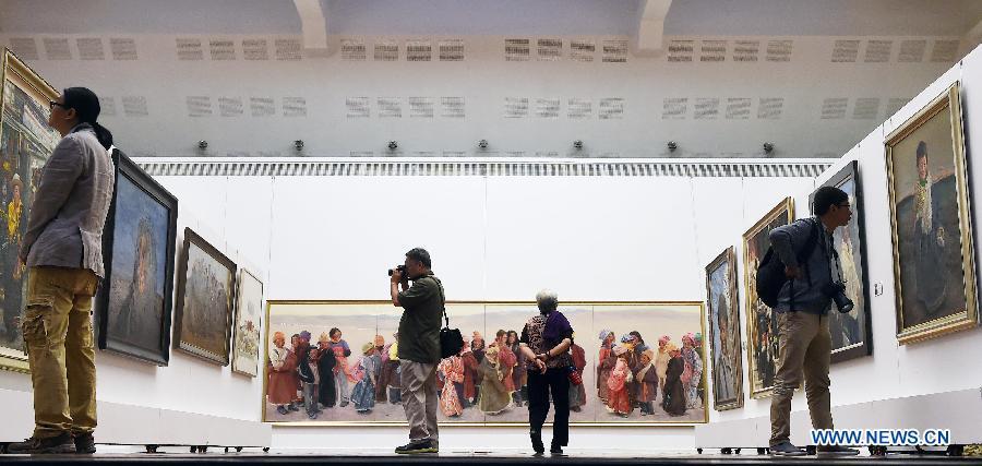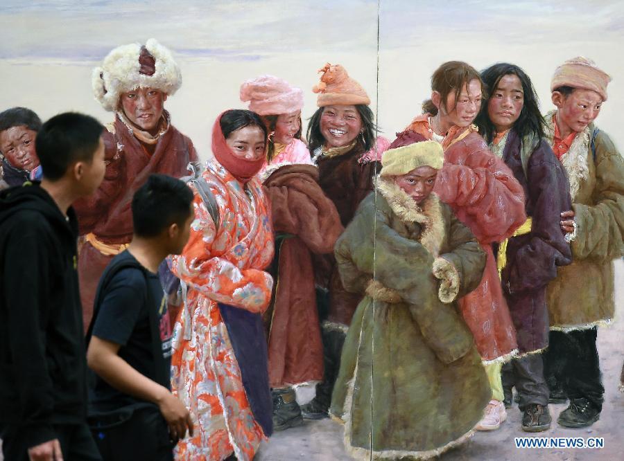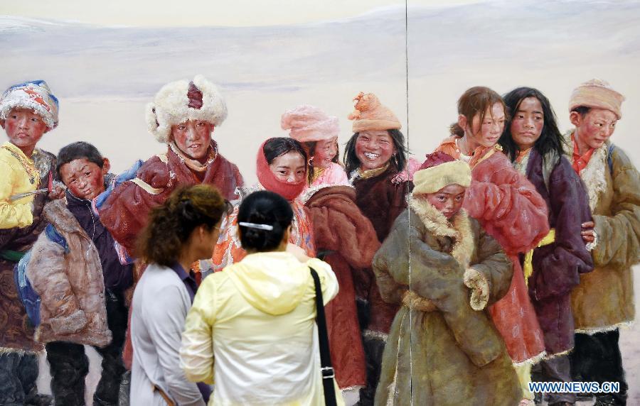 Women look at a painting displayed at an exhibition of fine arts about Tibet at Yanhuang Art Museum in Beijing, capital of China, Sept. 23, 2015. The exhibition named Extremely Beautiful Tibet is to celebrate the 50th anniversary of the establishment of southwest China's Tibet Autonomous Region. It will last until Oct. 7. (Photo: Xinhua/Chen Yehua)