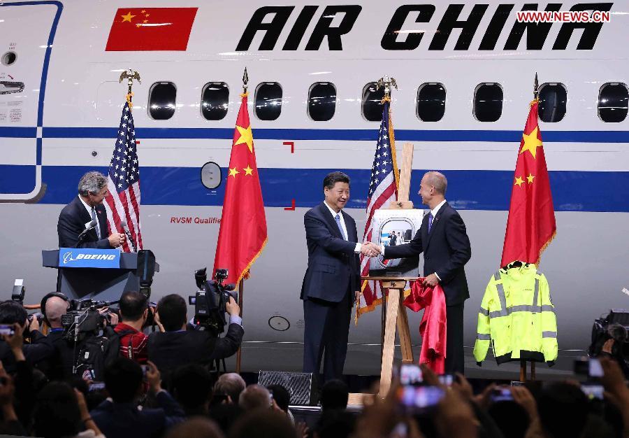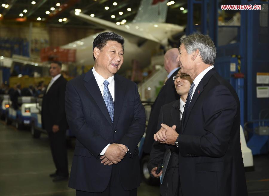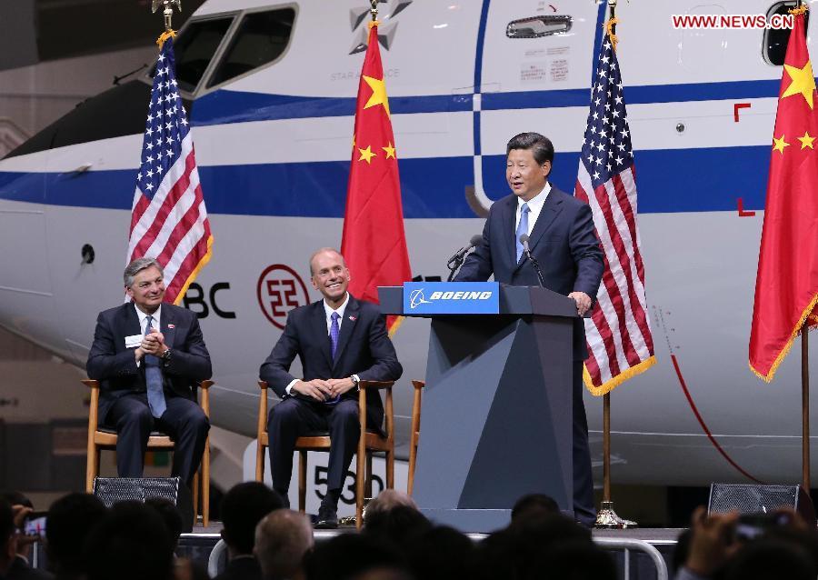 Chinese President Xi Jinping addresses a welcome ceremony held by Boeing Company during his visit to the Boeing Company's commercial airplane factory in Everett of Washington State, the United States, Sept. 23, 2015. (Photo: Xinhua/Li Tao)