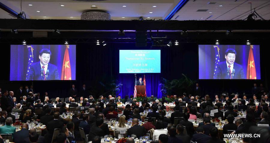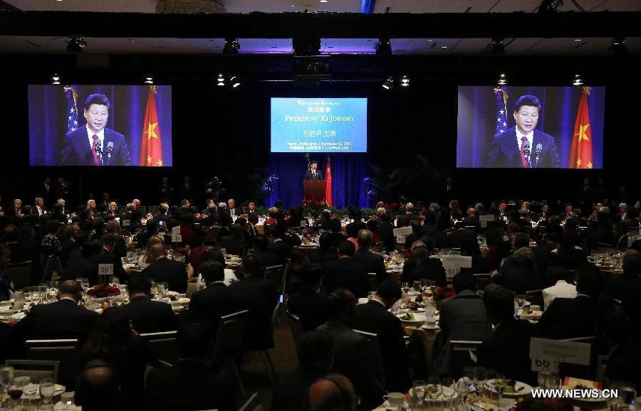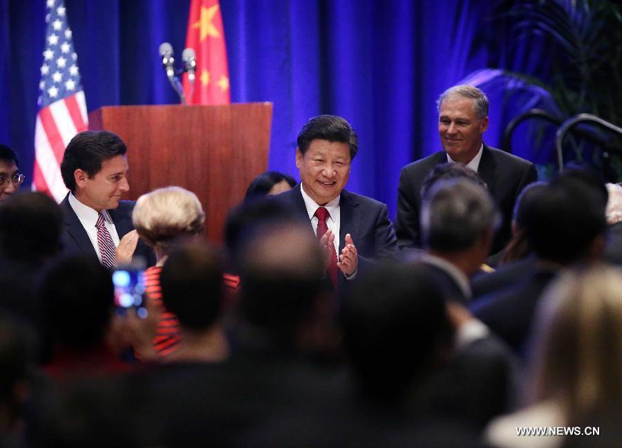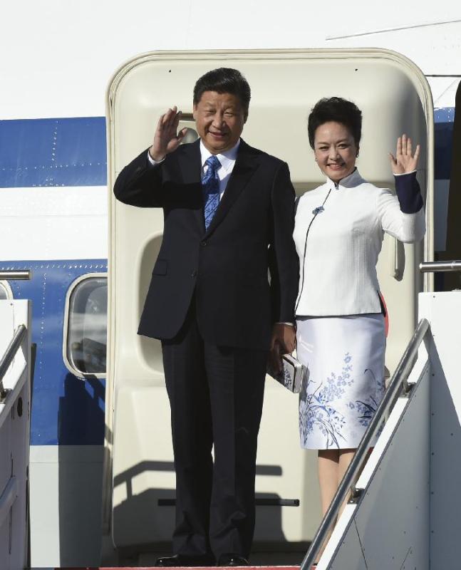 Chinese President Xi Jinping (L) and his wife Peng Liyuan wave upon their arrival in Seattle, the United States, Sept. 22, 2015. Xi arrived in this east Pacific coast city on Tuesday morning for his first state visit to the U.S. (Photo: Xinhua/Li Xueren)