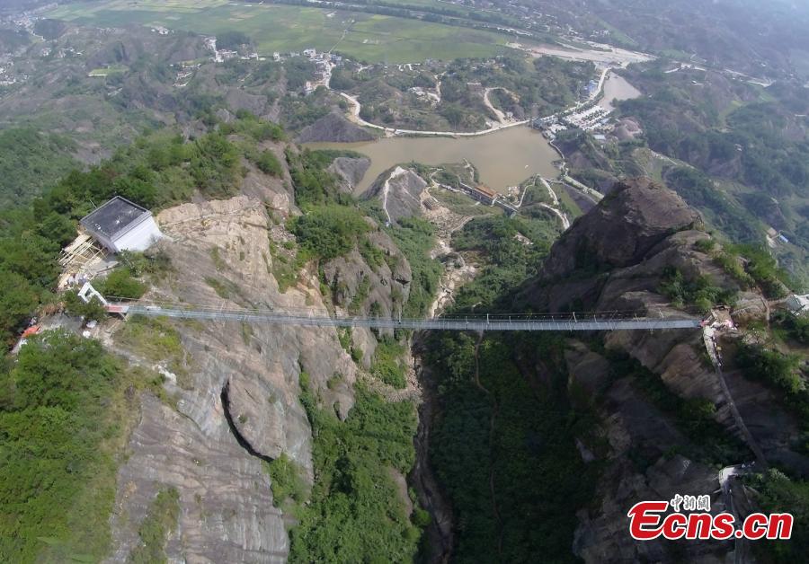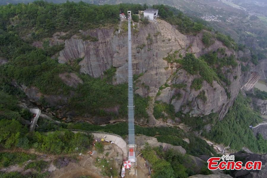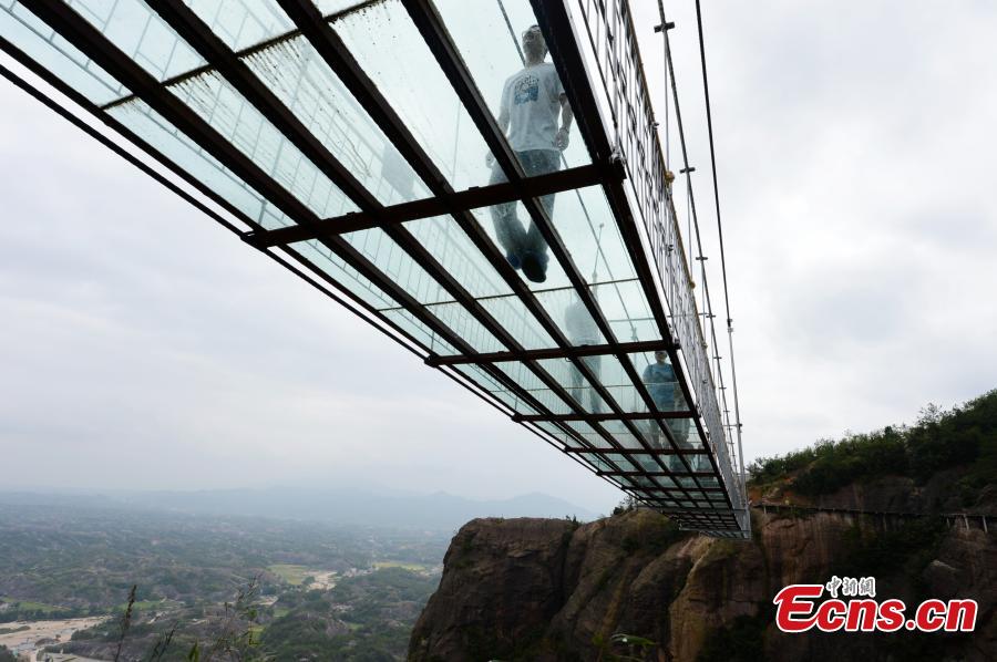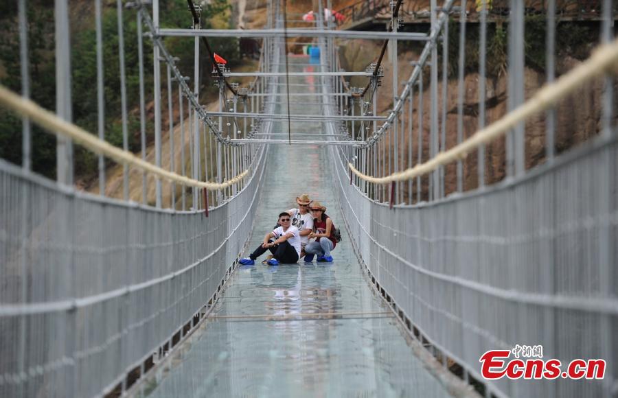 A visitor walks on a glass suspension bridge that sits 180 meters above the ground in Pingjiang county, in Central China’s Hunan province on September 24, 2015. The bridge stretches 300 meters between two rocky peaks and opened to the public on Thursday. (Photo: China News Service/Yang Huafeng)