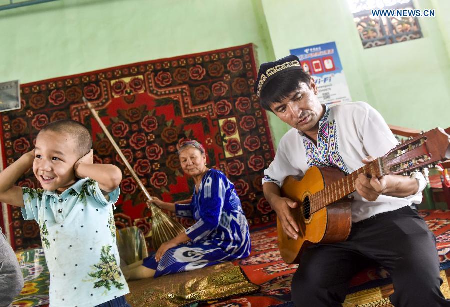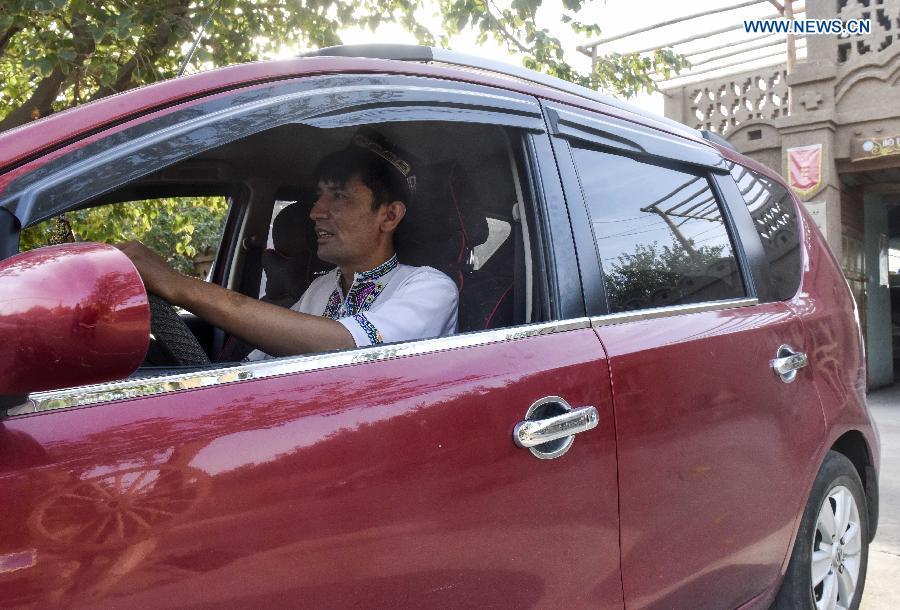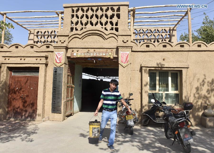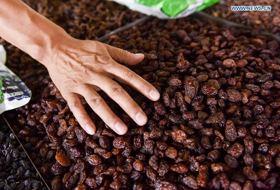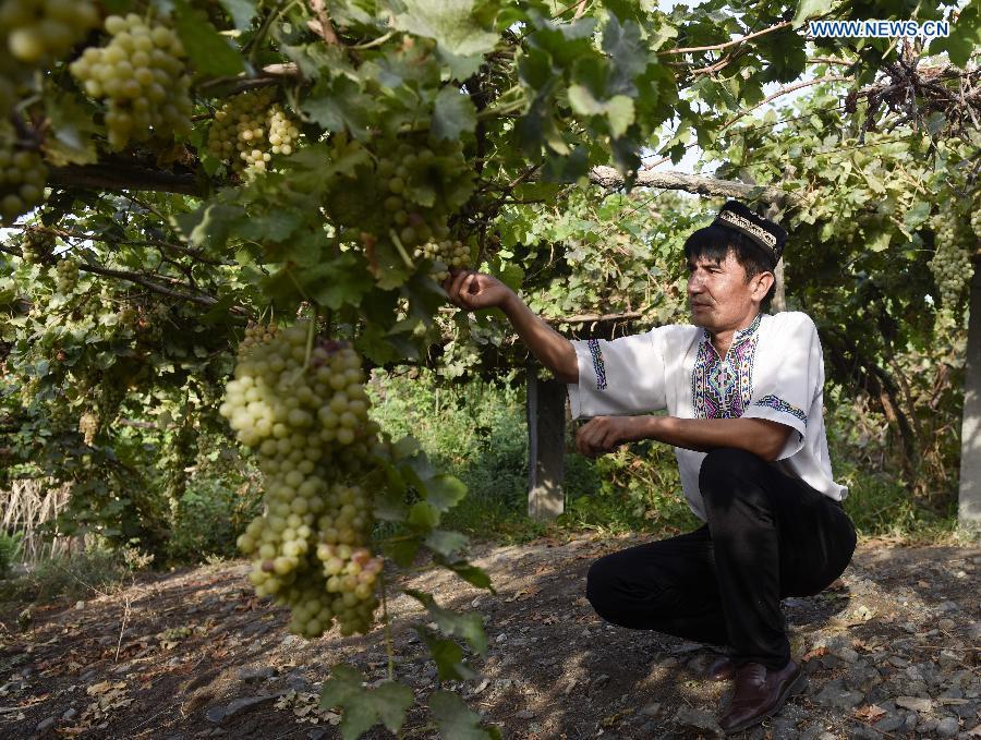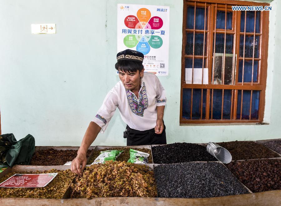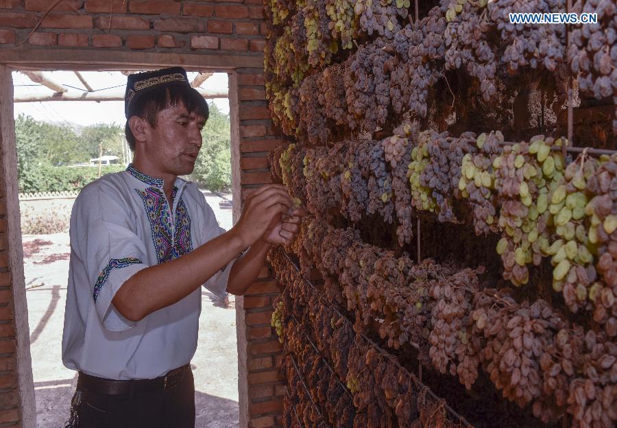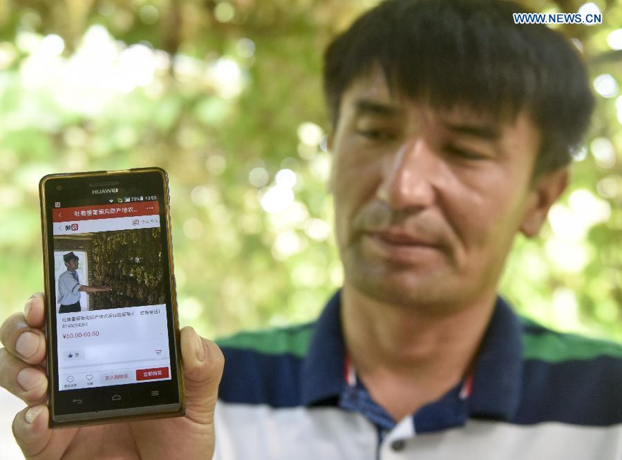 Pataer Keyimu introduces (L) dried grapes to a customer at home in the Grape Valley of Turpan, northwest China's Xinjiang Uygur Autonomous Region, Sept. 7, 2015. Compared with life of his grandfather, Pataer leads a new way of life by not only growing and selling grapes, but also tourism and other business thanks to the internet. In 2010, Pataer started a family stay business and sold local products, such as dried grapes, to attract tourists. This year, he estimates that the yearly earnings would reach 150,000 RMB yuan (about 23,505 US dollars). As the 3G service provided by China Telecom covered his hometown in 2010, Pataer opened an online shop to promote his business for nationwide customers. As the harvest season for drying grapes falls recently, Pataer is busy everyday with his smart phone and internet orders. (Photo: Xinhua/Zhao Ge)