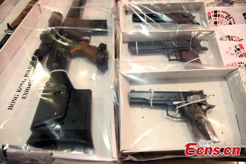 Hong Kong Police Force displays guns confiscated during a press conference on Sept. 23, 2015. More than 4,300 including around 1,100 from the mainland have been arrested in a joint campaign under the code name of "Thunderbolt 15" by Hong Kong Police Force from June 15 to Sept. 18, 2015. Major crimes uncovered by police included drug dealing, gambling, prostitution and parallel trading in a three-month cross-border anti-triad operation in Hong Kong, Macao and Guangdong province from mid June to mid September, said Au Chin Chau, chief superintendent of the Hong Kong police’s Organized Crime and Triad Bureau. Confiscated goods worth around HKD 67 million. (CNS photo/Hong Shaokui)