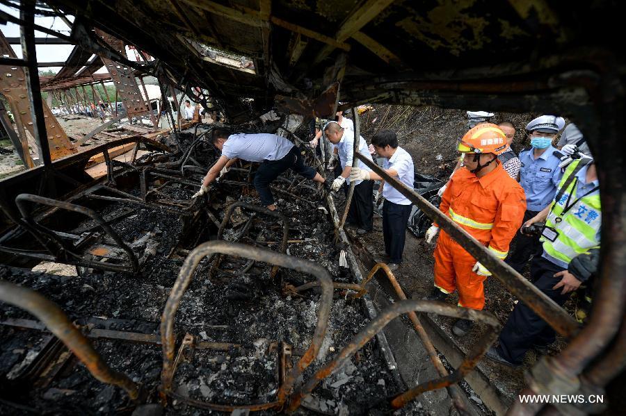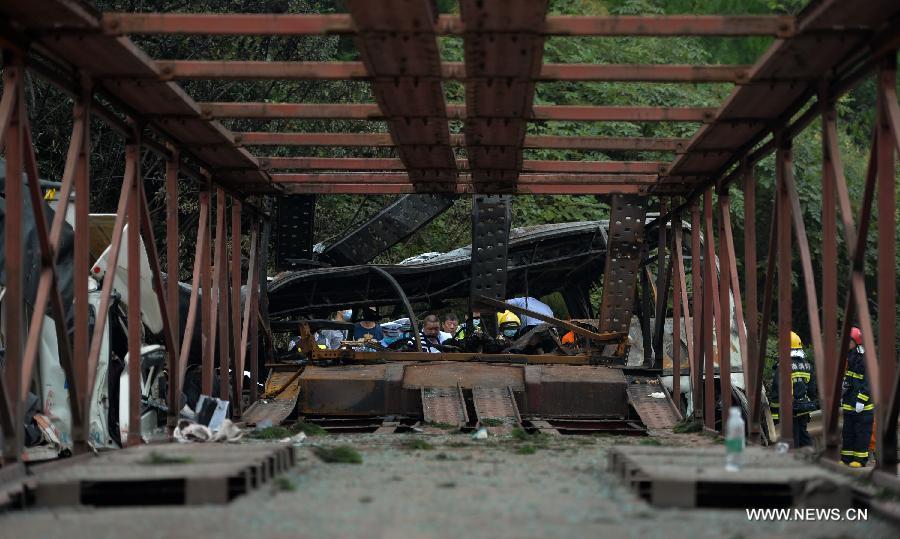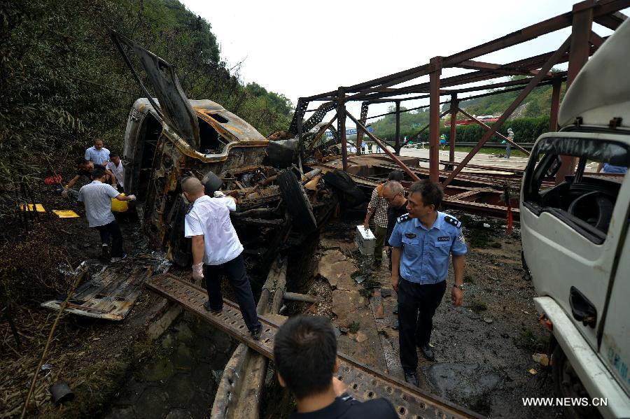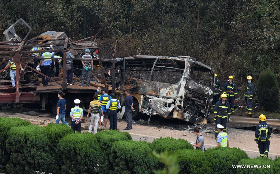 Rescuers work at the site of a highway accident in central China's Hunan Province, Sept. 25, 2015. A total of 21 people died and 11 others were injured on Friday after a collision involving four vehicles on an expressway in central China's Hunan Province. (Photo: Xinhua/Bai Yu)
