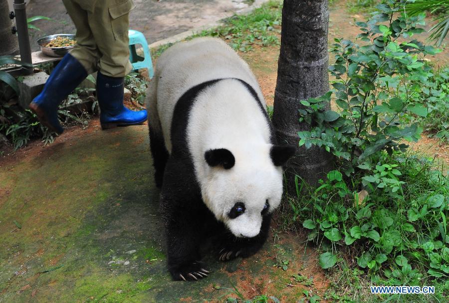 A keeper feeds giant panda Basi at the panda research and exchange center in Fuzhou, capital of southeast China's Fujian Province, Sept. 25, 2015. Basi will turns 35 in November, making her over 100 in human years. The panda research and exchange center in Fuzhou want to invite 50 VIPP (very important panda people), including the American breeders and members of the public that the centenarian panda met during her performance tour in San Diego in 1987. Basi is possibly the most famous panda in China. In 1990, she was chosen as the prototype for Pan Pan, the mascot for the Beijing Asian Games. (Photo: Xinhua/Zhang Guojun)