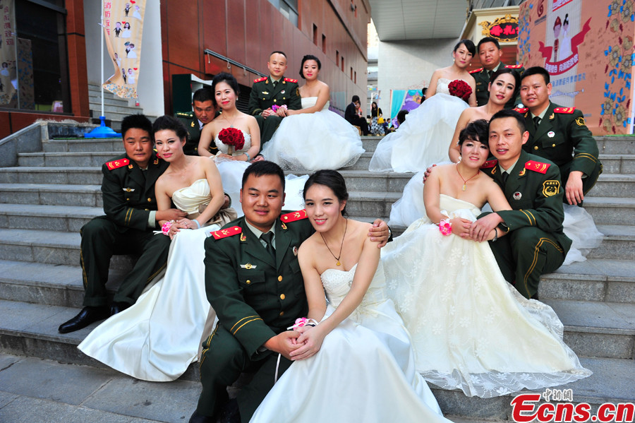 Seven fire fighters from Kunming Fire Detachment of SW China's Yunnan Province hold a group wedding in Kunming Worker’s Culture Hall on Sept. 24, 2015. (CNS photo/Liu Ranyang)