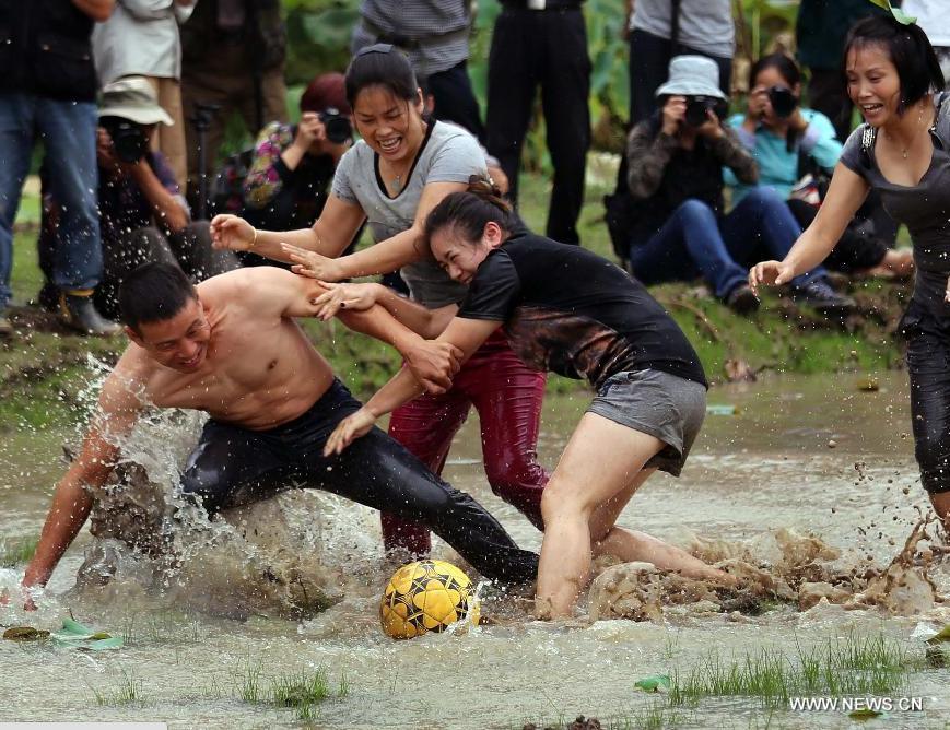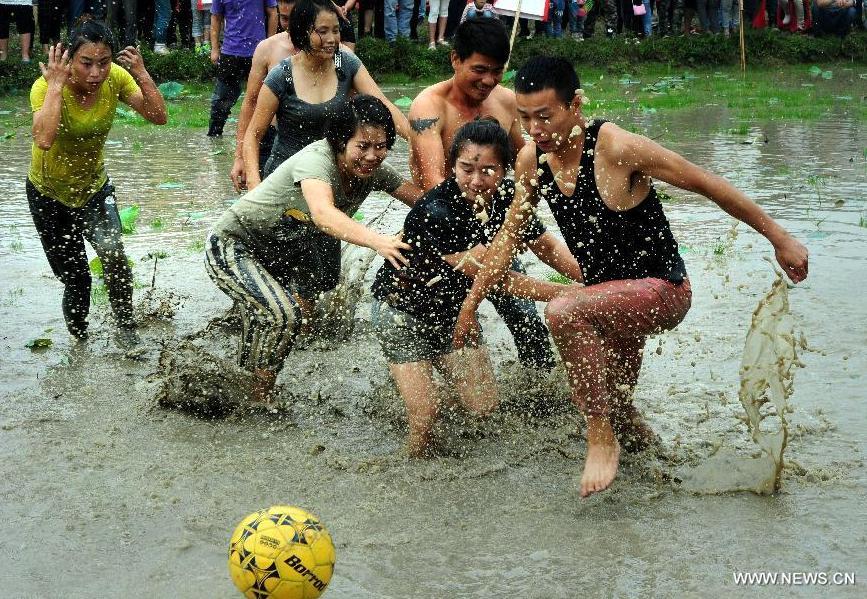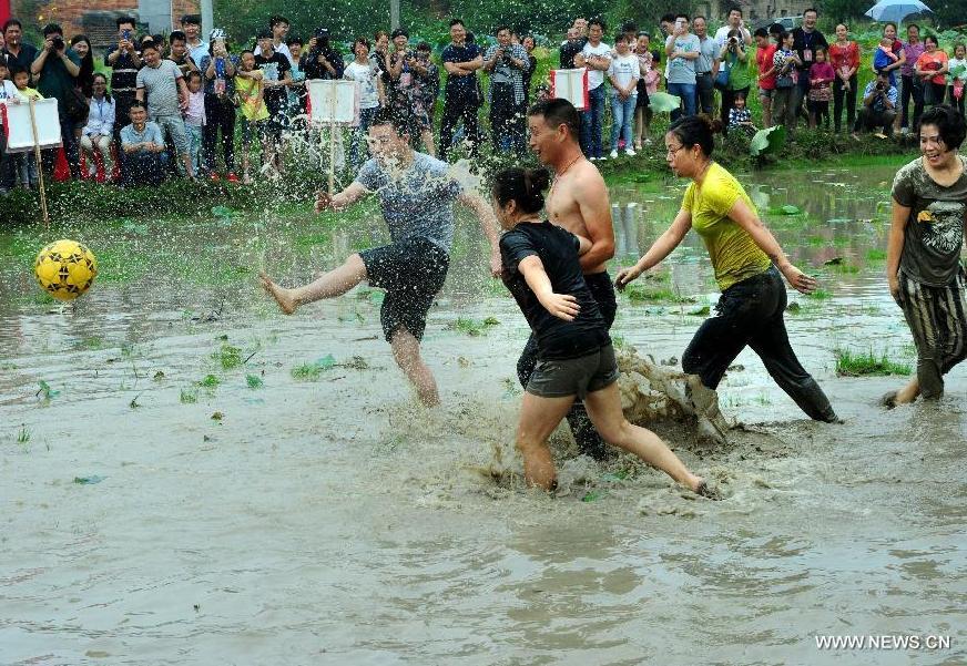 People play soccer in mud in Housangyuan Village of Lyutan Township of Wuyi County, east China's Zhejiang Province, Sept. 26, 2015. Local villagers held a mud soccer competition to celebrate the upcoming Mid-Autumn Festival. (Photo: Xinhua/Zhang Jiancheng)