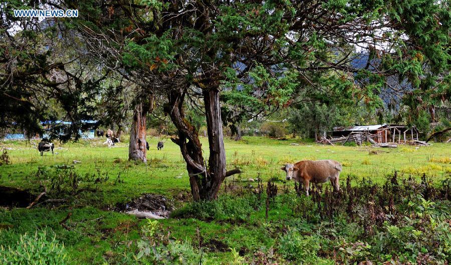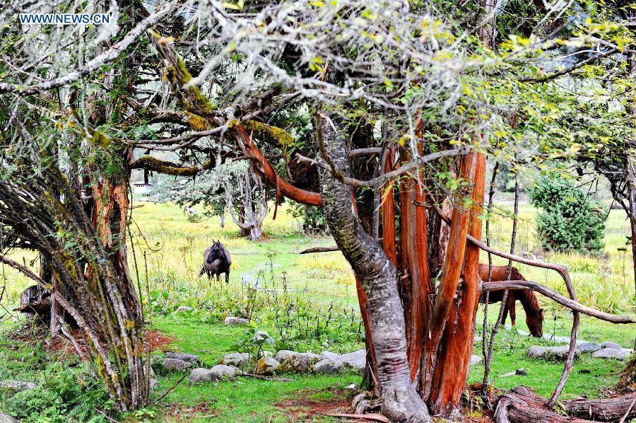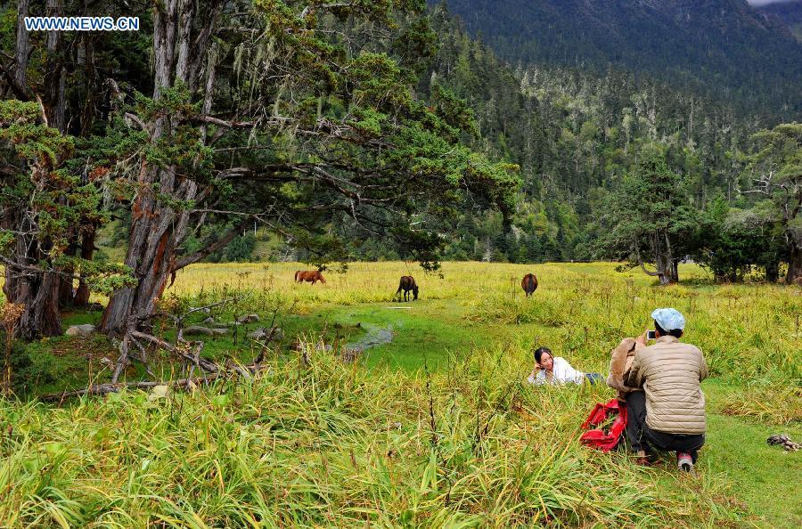 Photo taken on Sept. 27, 2015 shows the Nanyigou Scenic Spot in Milin County of Nyingchi City, southwest China's Tibet Autonomous Region. Nyingchi, which locates in the southeastern part of Tibet region, is a prefecture-level city at the lowest elevation in Tibet region. Thanks to its warm and moist weather, its forest coverage rate stands at 51.95 percent. (Photo: Xinhua/Zhang Rufeng)