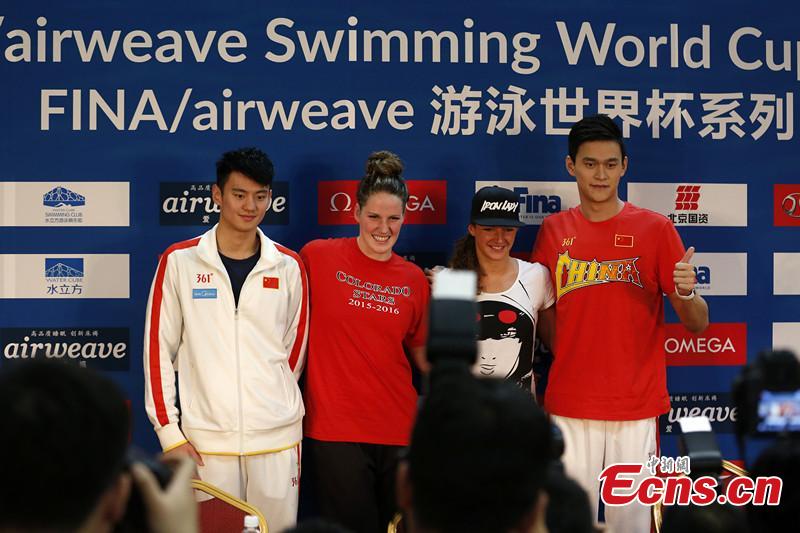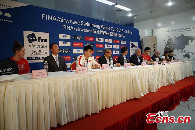 FINA/airweave Swimming World Cup 2015-Beijing held a press conference in Beijing, Sept. 28,2015. The match will begin in Sept. 29. (CNS photo/Han Haidan)