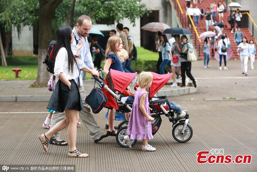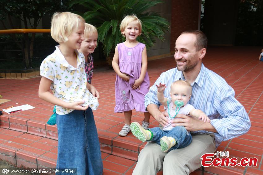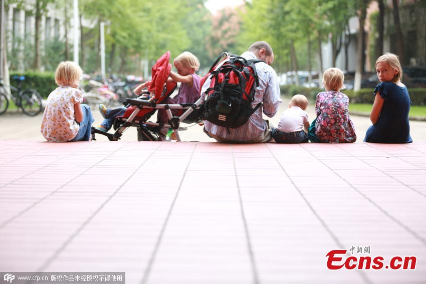 Andrzej Glos, a 36-year-old software designer, and his wife Evgeniya Glos take care of their six daughters during the class break at a university in Ningbo, Zhejiang province on September 28, 2015. The Polish couple came to China to study Chinese as overseas students in Zhejiang Wanli University this September. They carry their daughters, aged between ten years and eleven months old, wherever they go. Since they haven't found a suitable nanny, they have to take turns to attend classes - one has to take care of children when the other has classes. (Photo/CFP)