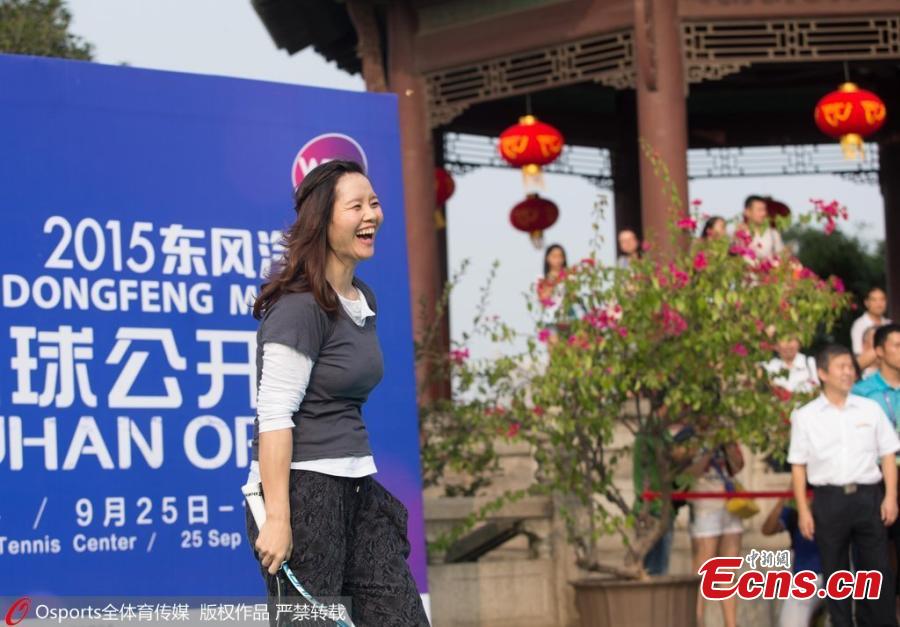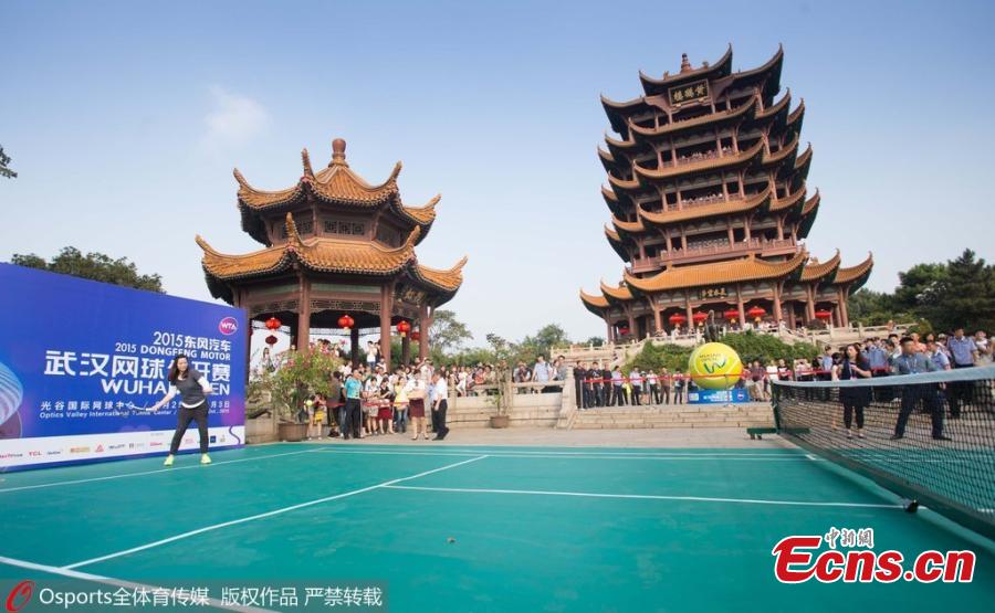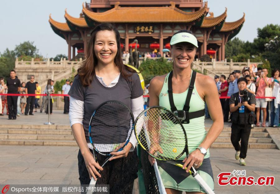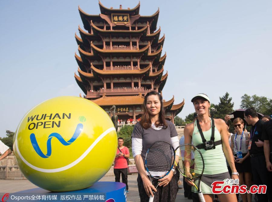 Tennis stars Li Na (L), and Martina Hingis pose for a photo during a promotion campaign for 2015 Wuhan Open in front of the Yellow Crane Tower, a historical landmark overlooking the Yangtze River, in Wuhan, Hubei province on September 28, 2015. (Photo/Osports)