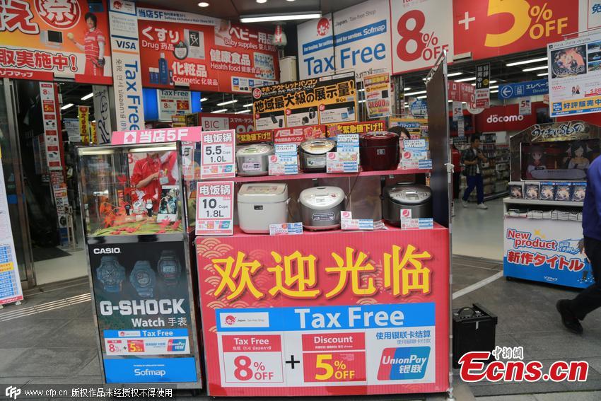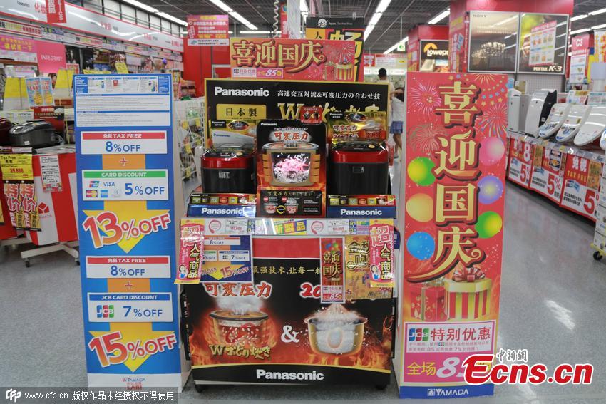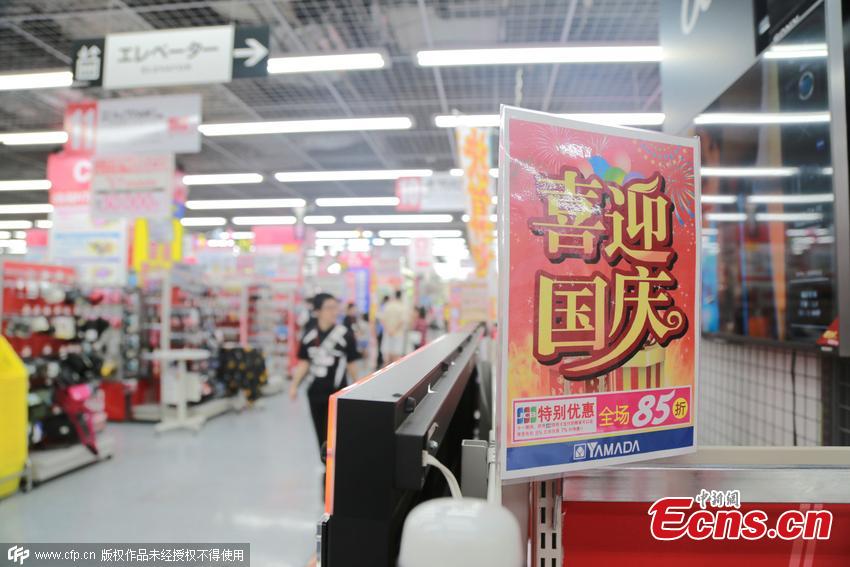 Signs saying “Special promotion campaign for National Day of China” are seen displayed at a shopping mall in Tokyo, Japan on September 27, 2015. (Photo/CFP)