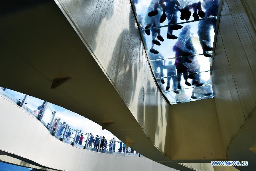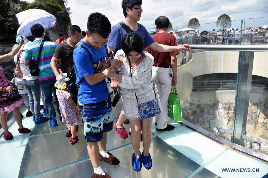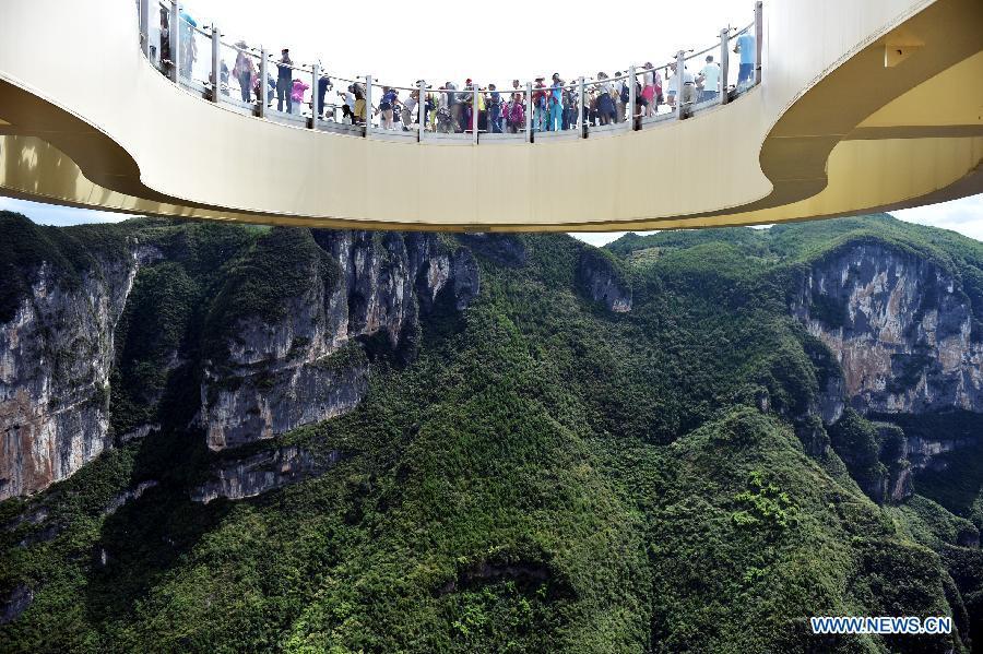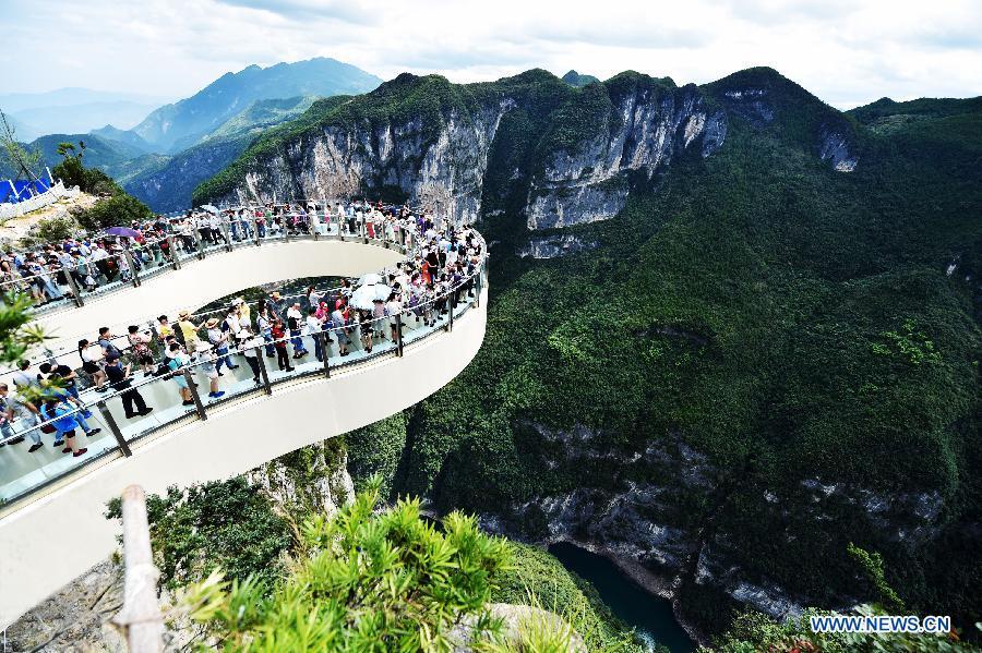 Tourists walk on a transparent horsehoe-shaped cantilever bridge at the Yunyang Longgang Geological Park in Chongqing, southwest China, Sept. 28, 2015. The visits to the cantilever bridge have kept hot since the end of September, with its daily reception reaching a peak of 30,000 people, five times more than its normal reception of 6,000 people. As the National Day holiday is coming, which falls on Oct. 1-7, local government has taken several measures to handle with the congestion, including expanding parking lots and maintaining accommodation reception capacity nearby. (Photo: Xinhua/Rao Guojun)