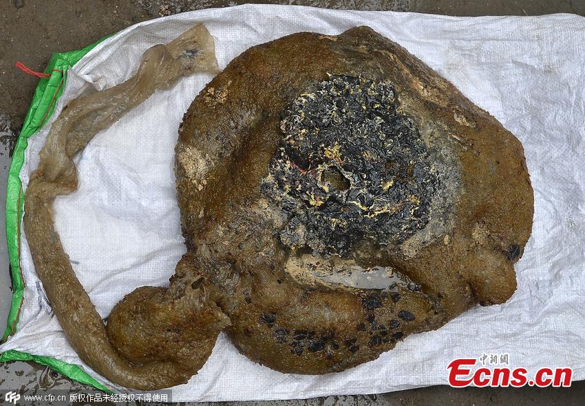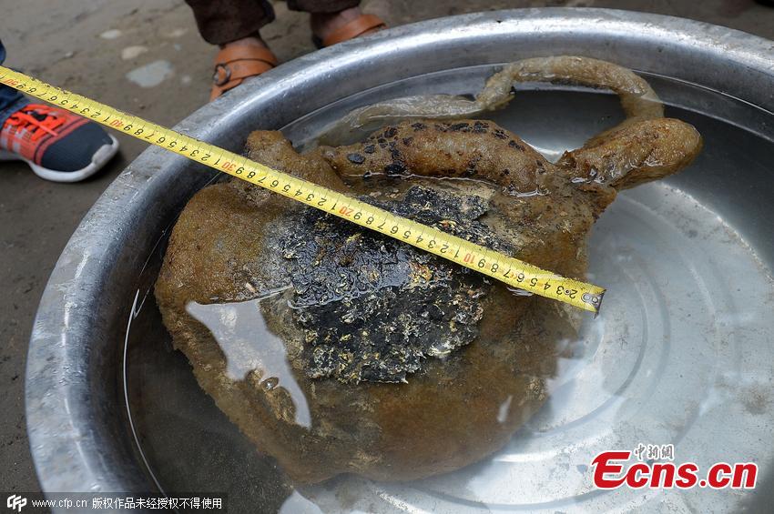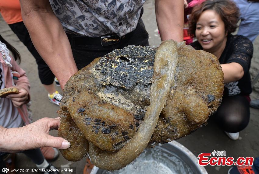 A villager shows a “creature” which is suspected as “Taisui”, a kind of myxomycete complex, or slime mold in Chengdu on September 29, 2015. The mysterious thing has yellow-colored appearance marked with black spots. Experts from Sichuan University said a gene identification is need before the creature being confirmed as “Taisui.” "Taisu," which is also the name of flesh-meat ganoderma, is a substance with medical functions, according to the Pen-tsao Kang-mu, a Chinese materia medica work written by Li Shizhen, one of the greatest Chinese doctors during the Ming Dynasty (1368-1644).(Photo/CFP)