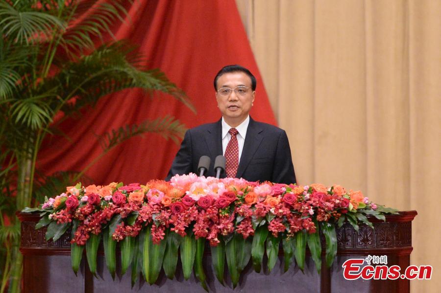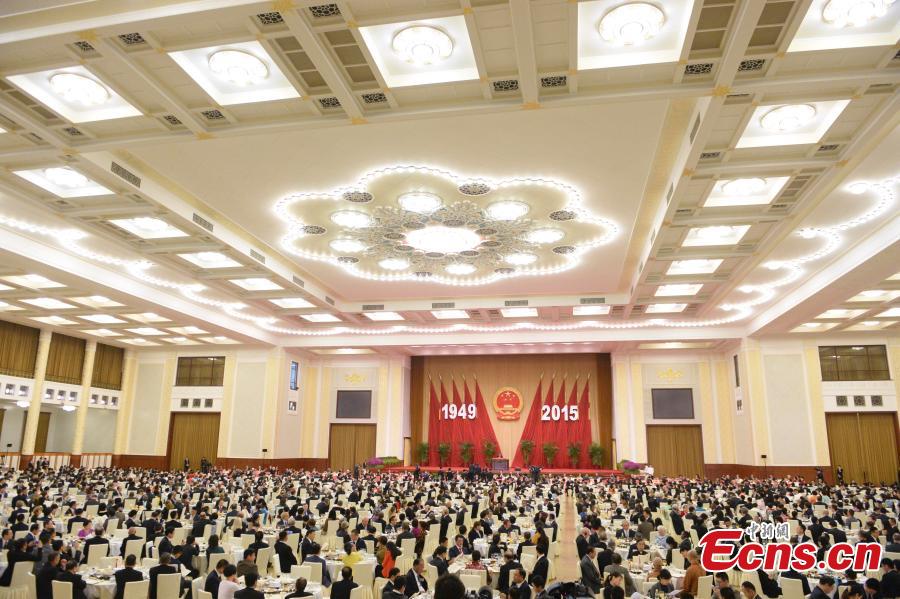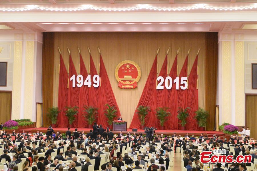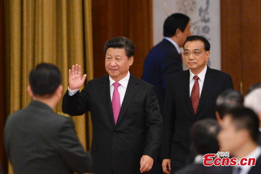 Chinese President Xi Jinping and Chinese Premier Li Keqiang walk into the Great Hall of the People to attend a reception held by the State Council to celebrate the 66th anniversary of the founding of the People's Republic of China, in Beijing, capital of China, September 30, 2015. (Photo: China News Service/Liao Pan)