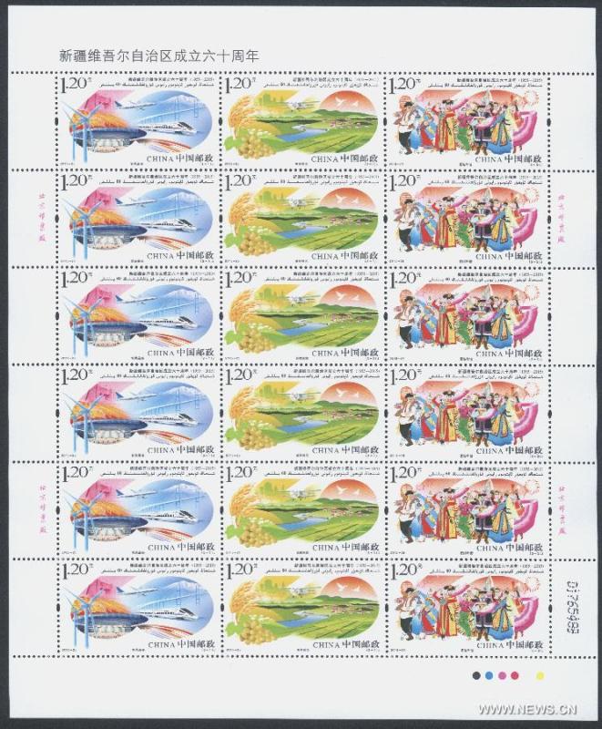 A staff member of China Post displays a commemorative first-day cover in Beijing, capital of China, Oct. 1, 2015. China Post issued a special stamp set for the 60th anniversary of the founding of Xinjiang Uygur Autonomous Region on Thursday. The set contains three commemorative stamps with respective themes. (Photo: Xinhua/Li He)