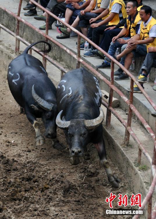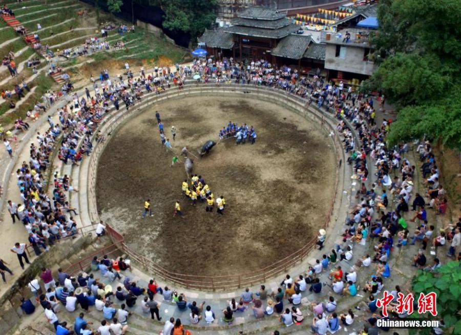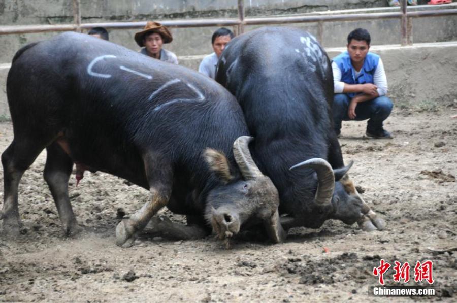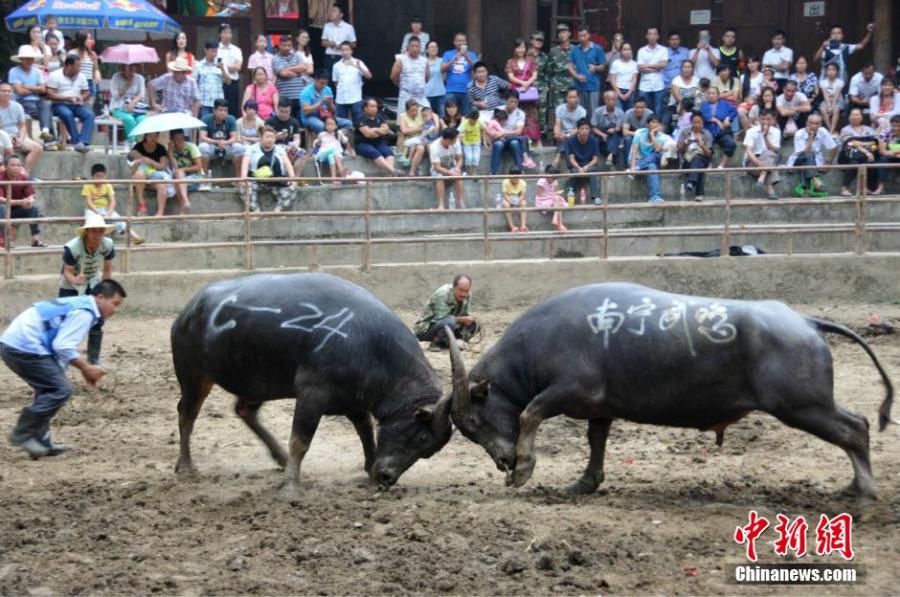 People watch buffalo fight during a festival in Sanjiang Dong autonomous county in Southwest China’s Guangxi Zhuang autonomous region, Sept. 1, 2015. More than 140 buffaloes will fight during the festival. (Photo: China News Service/ Gong Pukang)