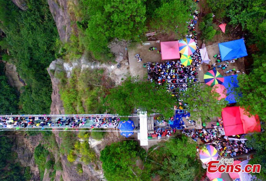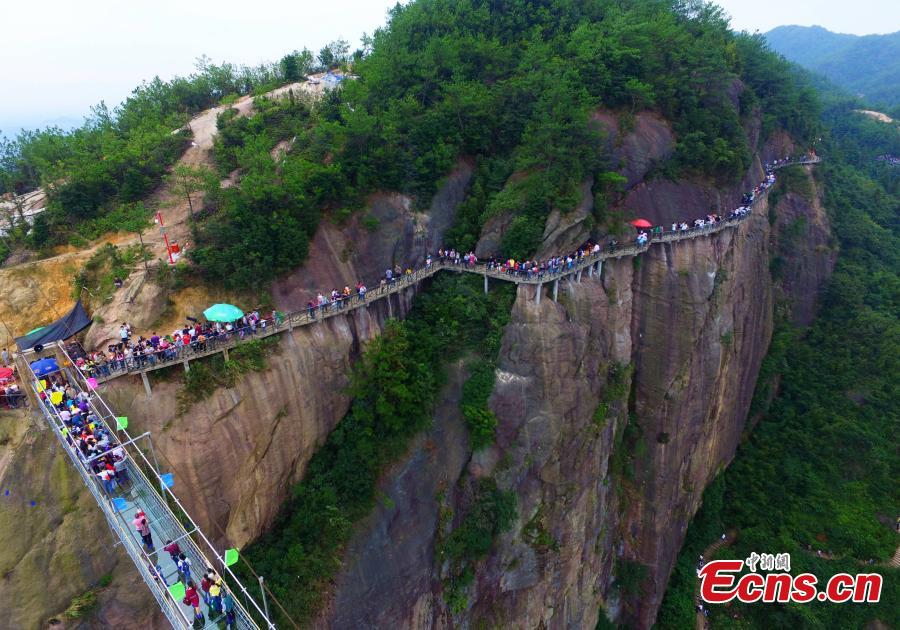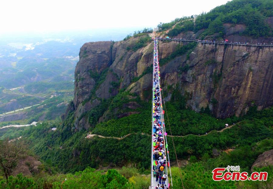 A photo taken on October 4, 2015 shows thousands of people on and near the all-glass bridge, which is located in Pingjiang County, in Central China's Hunan province. The all-glass bridge is suspended 180 meters over a canyon. It received around 20,000 visitors on last Friday, the second day of China's current week-long National Day holiday. (Photo: China News service/Liu Hongqiang)
