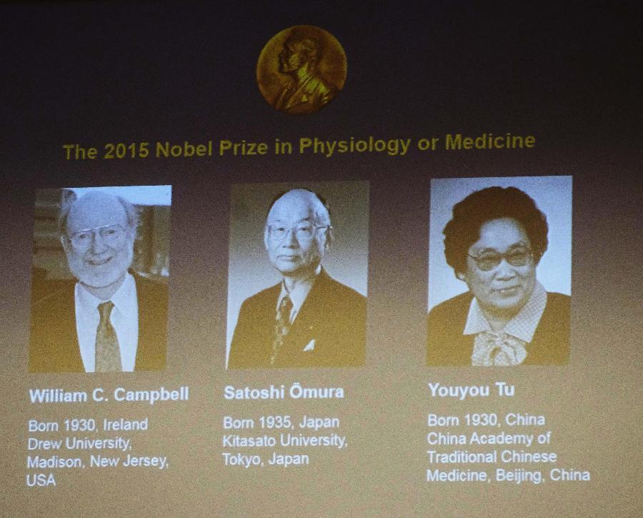 A screen shows the 2015 Nobel laureates for Physiology or Medicine including China's Tu Youyou, Japan's Satoshi Omura and Irish-born William Campbell (R to L) at the Karolinska Institute in Stockholm, Sweden, Oct. 5, 2015. China's Tu Youyou, Irish-born William Campbell and Japan's Satoshi Omura jointly won the 2015 Nobel Prize for Physiology or Medicine, the Nobel Assembly at Sweden's Karolinska Institute announced Monday. Tu won half of the prize "for her discoveries concerning a novel therapy against Malaria", while Campbell and Omura were jointly awarded the other half of the prize "for their discoveries concerning a novel therapy against infections caused by roundworm parasites," said the assembly. (Photo: Xinhua/Rob Schoenbaum)