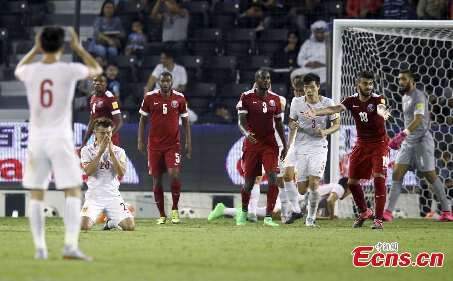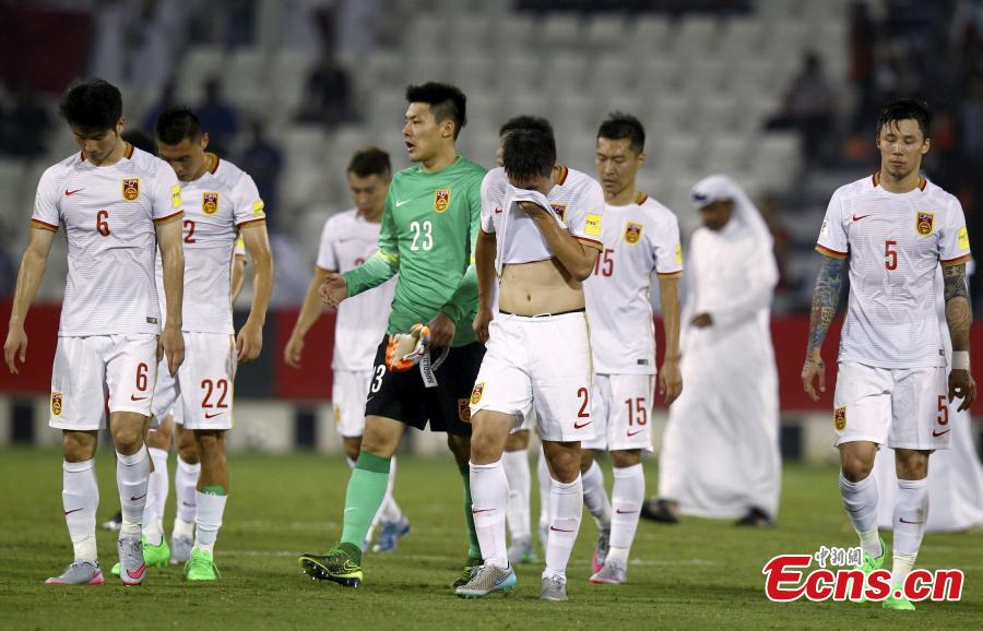China soccer team players walk off the field after losing to Qatar at the 2018 World Cup qualifying soccer match in Doha, Qatar, October 8, 2015. Qatar won 1-0. The victory sends Qatar to the top of Group C with all the possible 12 points after 4 games, and the Gulf Cup champions now have the best chance to qualify from the group as leaders, while China now sits on the third place with 7 points.(Photo/Agencies)