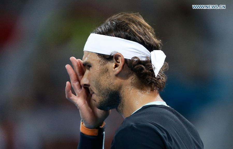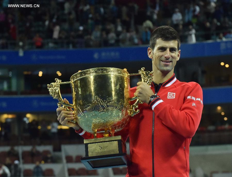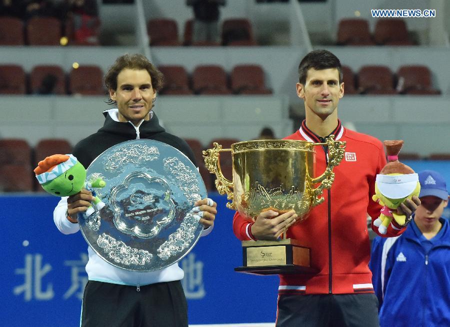 Novak Djokovic (R) of Serbia and Rafael Nadal of Spain attend the awarding ceremony for the men's singles final at 2015 China Open Tennis Tournament in Beijing, China, Oct. 11, 2015. Djokovic claimed the title of the event after beating Nadal 2-0. (Photo: Xinhua/Li Wen)