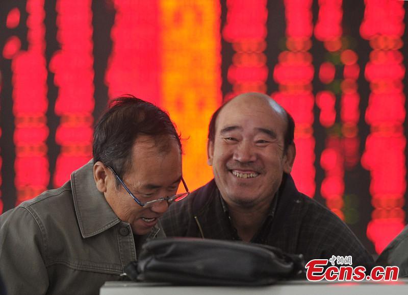 Citizens are seen at a stocks market in Taiyuan, Shanxi Province, Oct. 12, 2015. The benchmark Shanghai Composite Index was up 3.28 percent to end at 3,287.66 points on Monday. The Shenzhen Component Index rose 4 percent to close at 10,961.36 points. (CNS photo/Wei Liang)