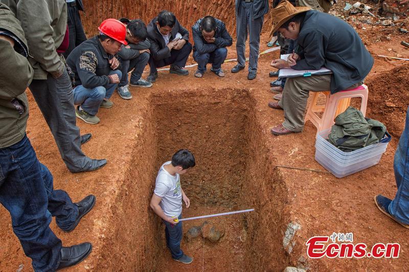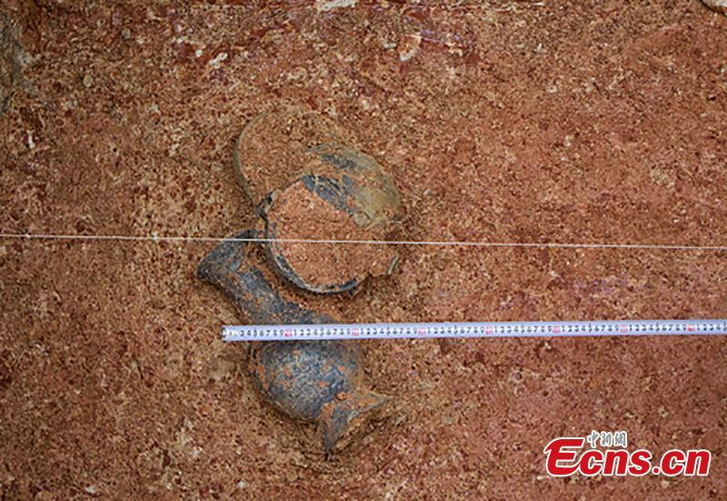 An archaeologist checks relics unearthed from an ancient tomb at a construction site in Changsha, Hunan province on October 10, 2015. A set of ancient cooking vessels including a tripod, a grain receptacle, and a pot were discovered from the tomb. Experts said a preliminary judgment indicated that those vessels were from the late Warring States Period. (Photo/CFP)