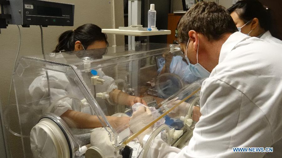 Two newborn giant panda twin cubs rest in an incubator at Toronto Zoo in Toronto, Canada, Oct. 13, 2015. Female giant panda Er Shun, who is on loan from China, gave birth to the twin cubs at 3:31 a.m. and 3:44 a.m. Tuesday. (Photo: Xinhua/Toronto Zoo)