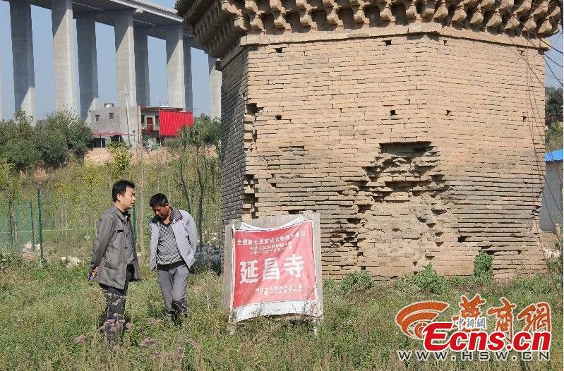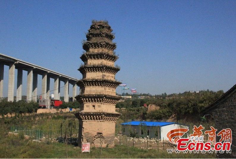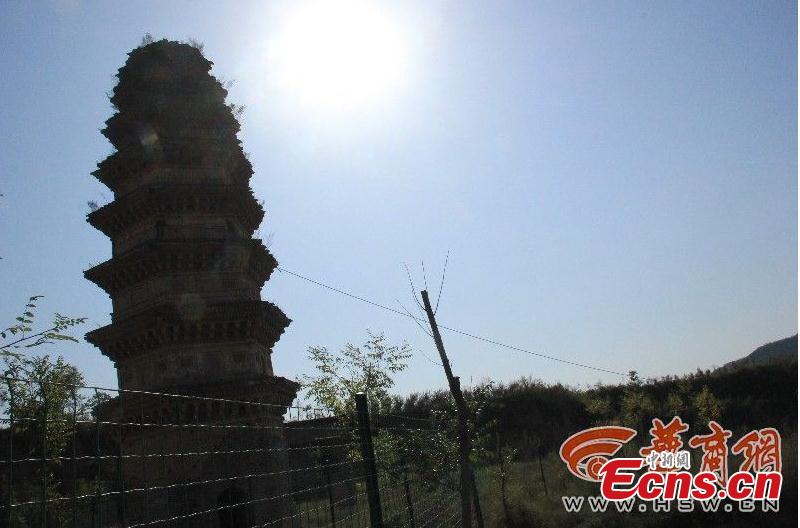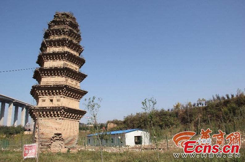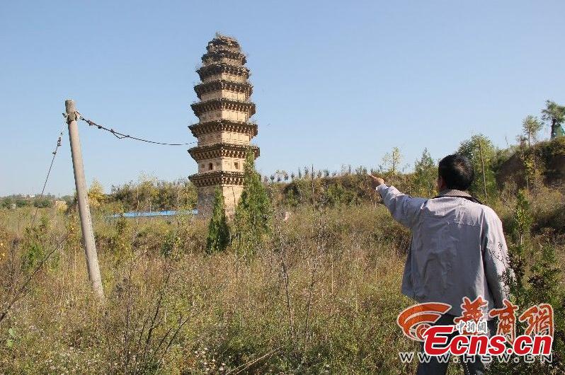A steel cable is seen fixed on a leaning ancient pagoda in Tongchuan, Northwest China’s Shaanxi province on October 12, 2015. The tower named Yanchangsi pagoda is over 1,000 years old and its tilt occurred two decades ago. To avoid the structure’s collapse, a steel cable was fixed between it and a nearby telegraph pole in a repairing project launched by local urban management committee in 2005. The history of the Yanchangsi pagoda dates back more than 1,000 years to the Song Dynasty (960-1279), and in 2013 it was listed as one of the national key cultural relics protection units. Two years ago, after the tower was discovered to be leaning over 11 degrees, local authorities drew up renovation plans, and are still waiting for funds from the government. (Photo/hsw.cn)