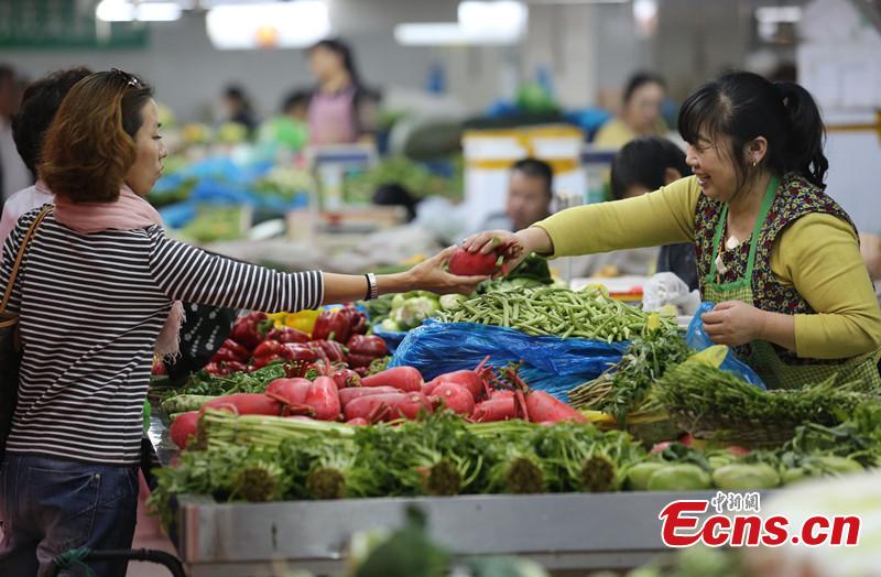 A resident purchases vegetables at a market in Nanjing, east China's Jiangsu Province, Oct. 14, 2015. China's consumer price index (CPI), the main gauge of inflation, rose 1.6 percent in September from last year, down from 2 percent in August, official data showed on Wednesday. (CNS photo/Yang Bo)