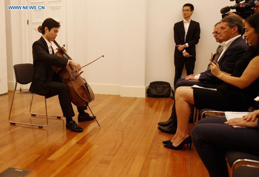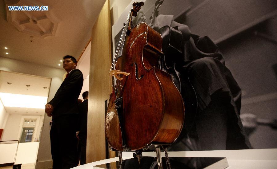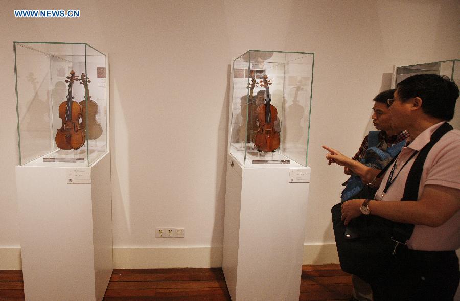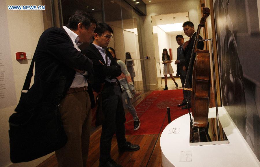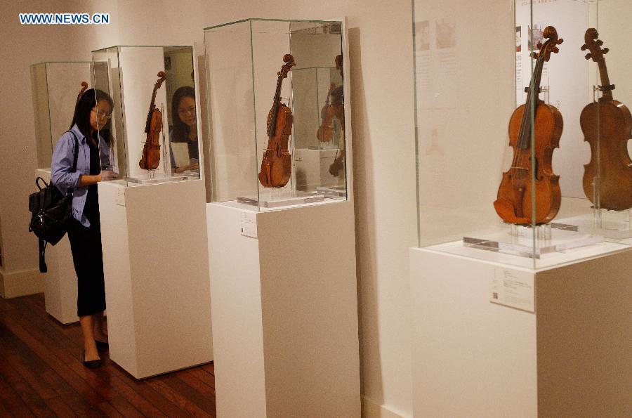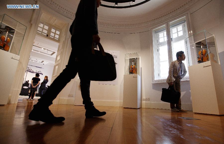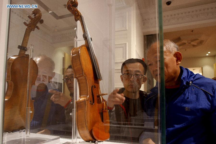 Visitors look at violins during a media preview of a Christie's private purchase exposition in Shanghai, east China, Oct. 15, 2015. Eight violins and cellos created by Italian instrument maker Antonio Stradivari and Giuseppe Guarneri were displayed at the expo with a total value of nearly 60 million U.S. dollars. (Photo: Xinhua/Fang Zhe)