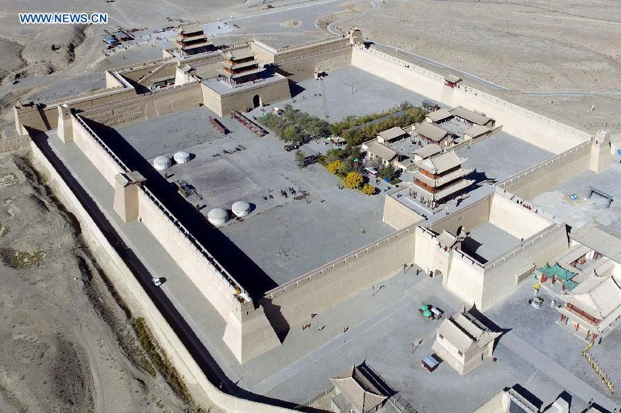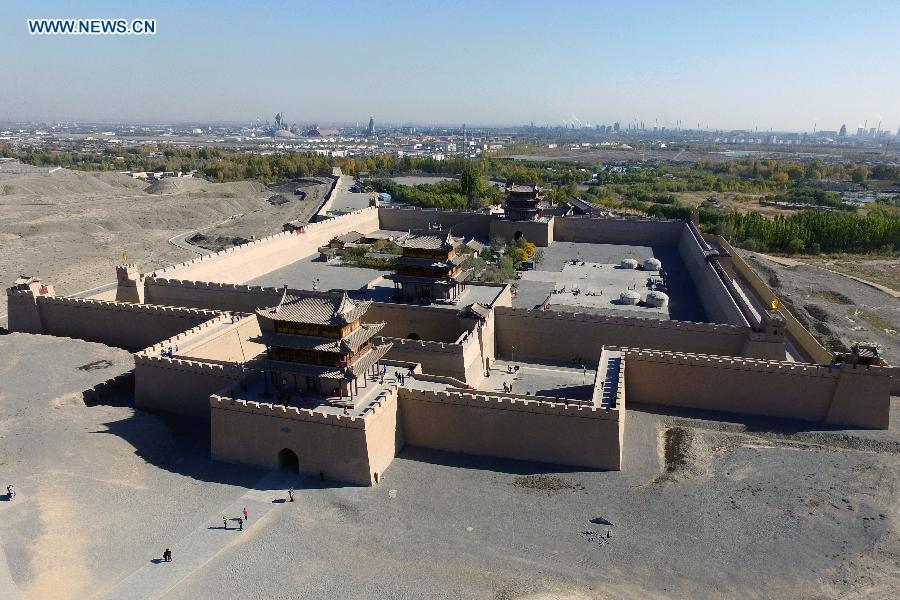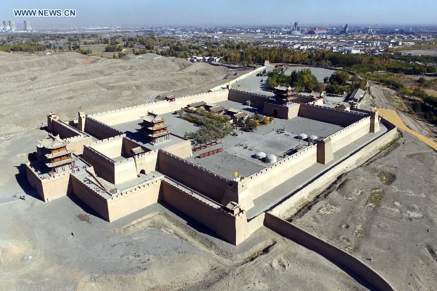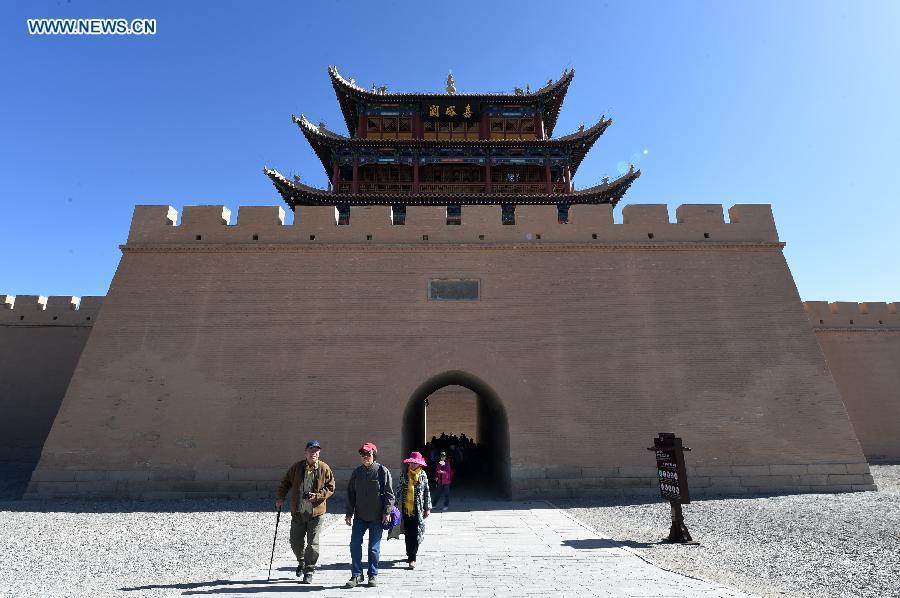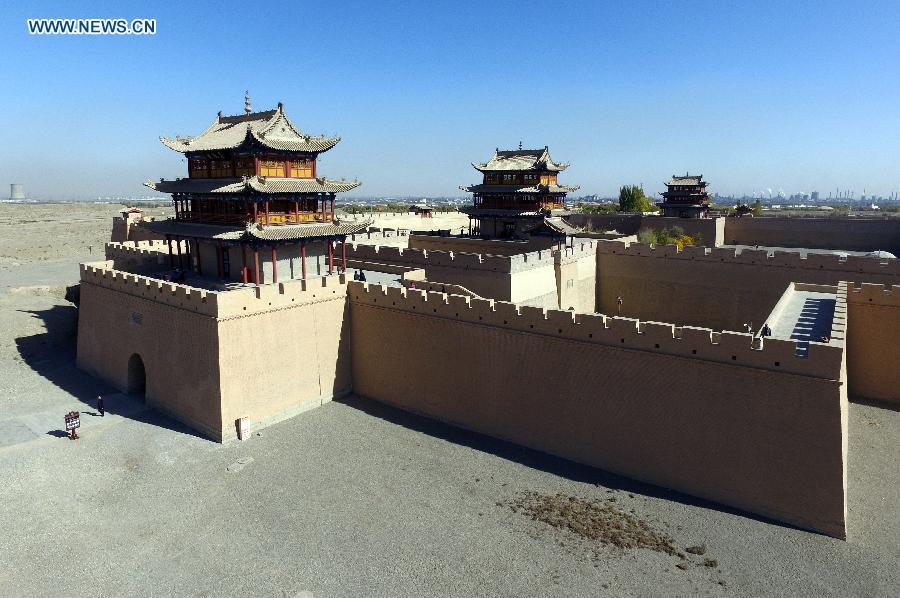 Photo taken on Oct. 14, 2015 shows the ancient fortress of Jiayuguan in northwest China's Gansu Province. The repair project of Jiayuguan has finished and it was open to public recently. The ancient fortress of Jiayuguan was built in 1372 and it is the western terminal of the Great Wall constructed during the Ming Dynasty (1368-1644). The repair project started since 2011 with an investment of 2.03 billion yuan (about 319 million U.S. dollars). (Photo: Xinhua/Fan Peikun)