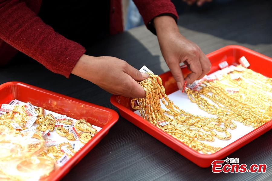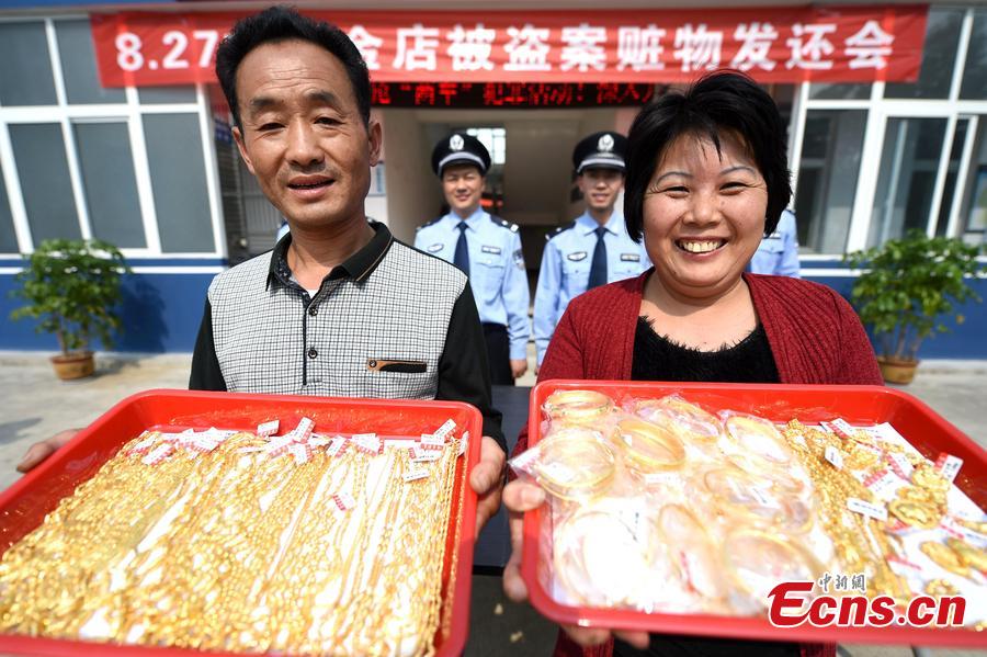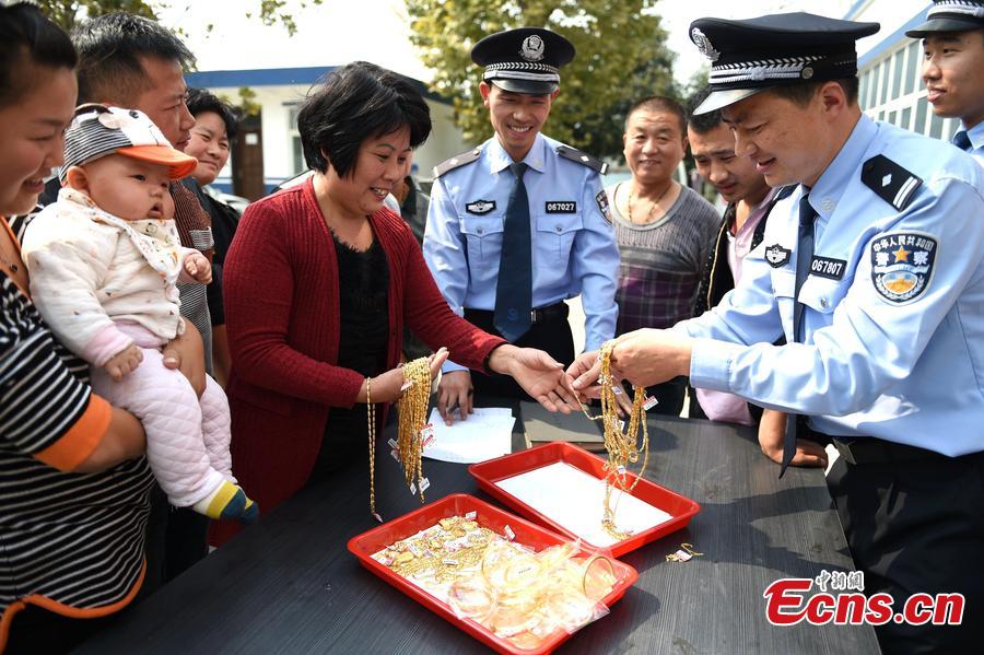Stolen gold necklaces are returned to a jewelry store in Bozhou, Anhui province on October 15, 2015. Nearly 100 pieces of gold jewelry worth over 800,000 yuan ($125,883) were stolen from the store on August 27, 2015. Suspect surnamed Dong was seized by local police, and all of the jewelry was returned. (Photo/CFP)