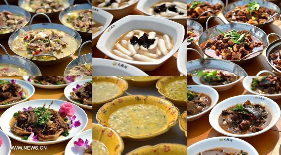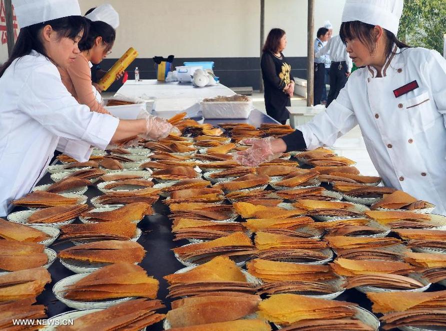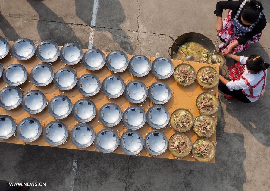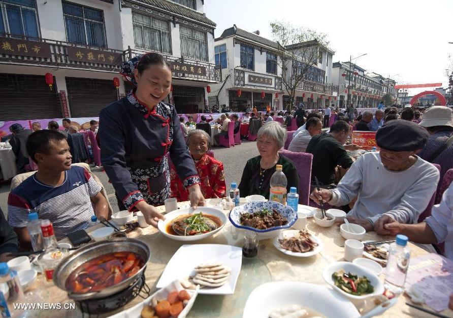 People enjoy a long table banquet in Jiangba Township of Hongze County, east China's Jiangsu Province, Oct. 17, 2015. A long table banquet was held here on Saturday to celebrate harvest and greet investors, local moral models and tourists. (Photo: Xinhua/He Jinghua)