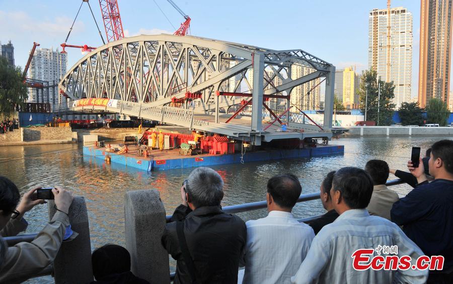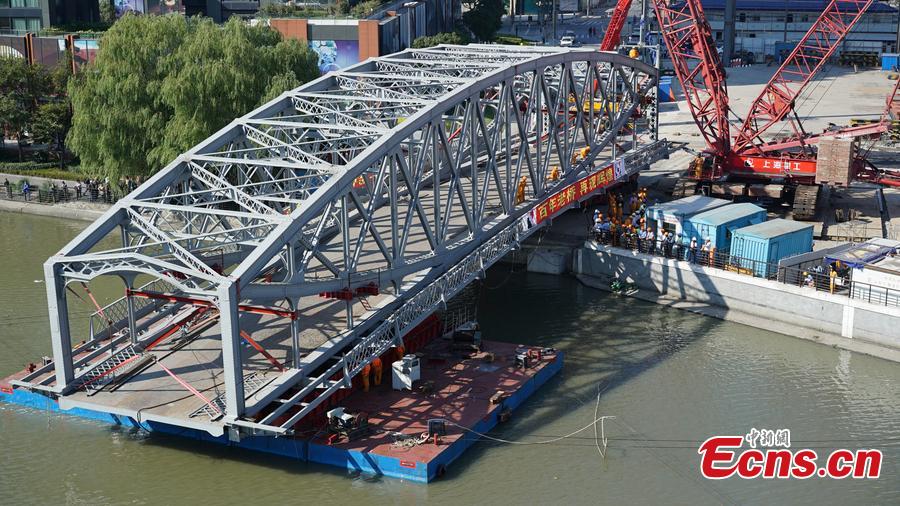 The 107-year-old Zhejiang Road Bridge, restored to its original appearance, is lifted back into position over Suzhou Creek in Shanghai on Sunday, October 18, 2015 in a 10-hour operation. The bridge, removed from its foundations four and a half months ago for renovation, could reopen to traffic by late December after finishing touches to the road surface and the installation of lights and cameras. Despite some unexpected difficulties, the project was finished one month ahead of schedule. (Photo/CFP)