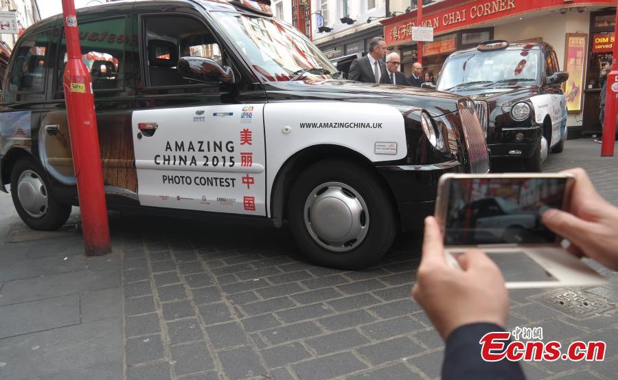 London taxis displaying pictures of China take to the roads of the British capital on Sunday, October 18, 2015. The photos were selected from the Amazing China: 2015 Mobile Phone Photo Contest, which encouraged tourists worldwide to discover the beauty of China by sending in photos for prizes. One hundred of the best photos are being displayed on a total of 50 London's cabs, which are owned by China's Geely company. (Photo: China News Service/ Shen Zhen)