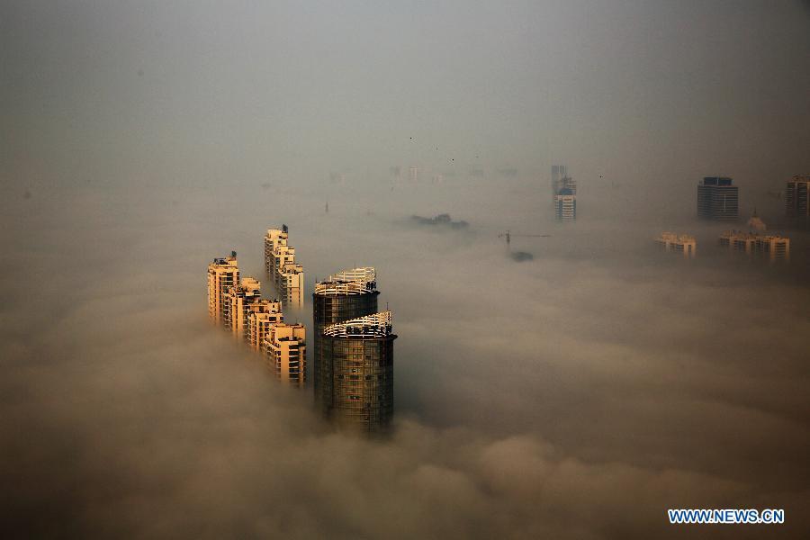 Buildings are enveloped by fog in Rizhao, a coastal city in east China's Shandong Province, Oct. 18, 2015. (Photo: Xinhua/Liu Mingzhao)