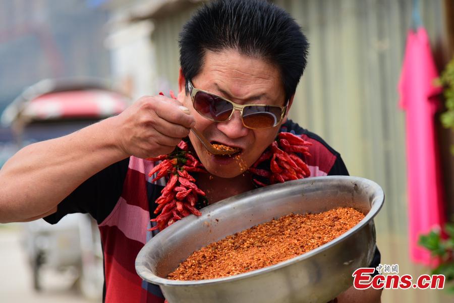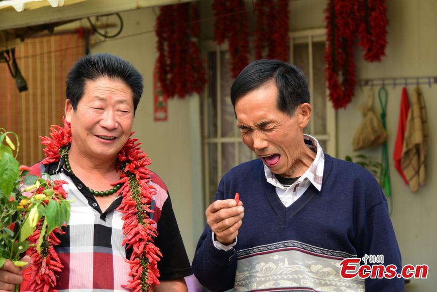 Li, a chili enthusiast poses with strings of dried chili peppers at his home in Zhengzhou, Central China’s Henan province on October 18, 2015. The man said he could eat 2.5kg of chili every day. (Photo/CFP)