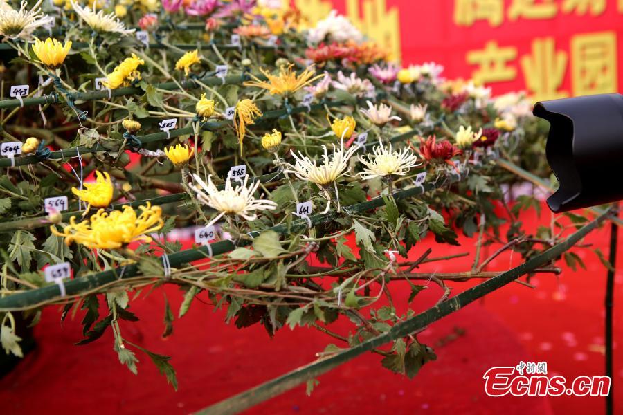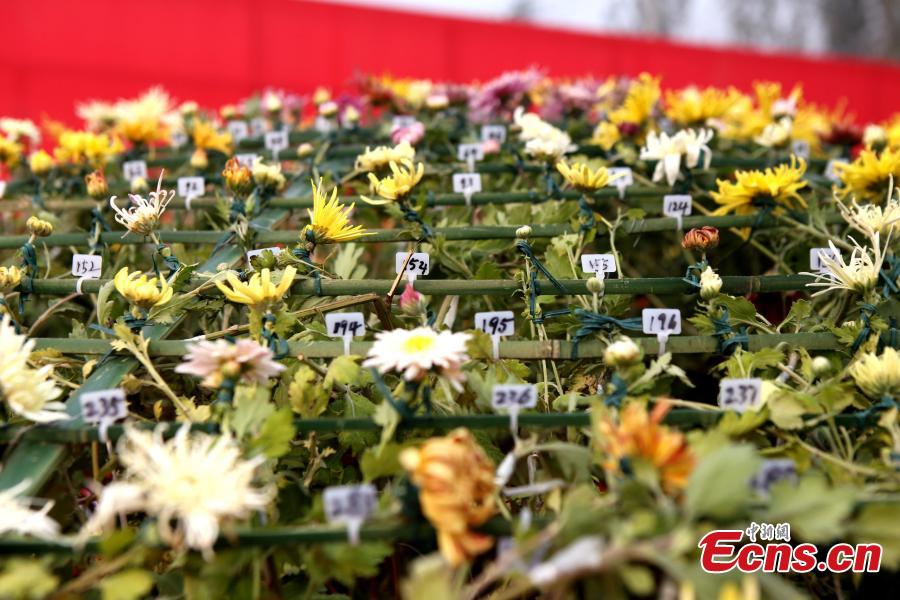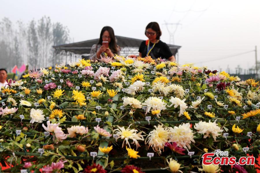 Visitors take pictures for a multiflorous chrysanthemum that containing the largest number of chrysanthemum species in Kaifeng, Central China’s Henan province on October 18, 2015. The multiflorous chrysanthemum is 3.8 meters in diameter and composed of 641 different types of chrysanthemums grafted to southernwood. It was certified for the Guinness Book of World Records on Sunday. It took about four years to cultivate the plant, which now has more than 1,500 flowers blossoming at one time.(Photo: China News Service/ Wang Zhongju)