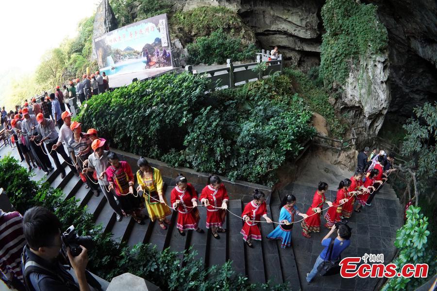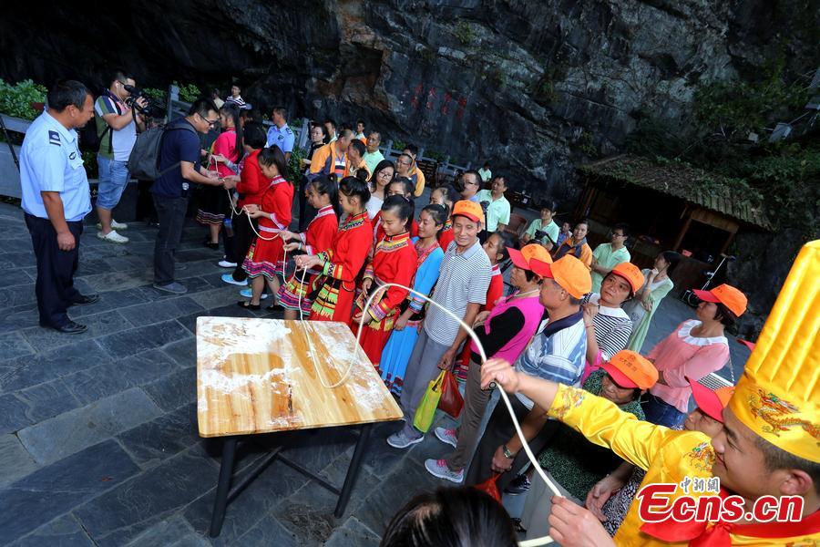 Visitors stand side by side and hold a long noodle during a cultural event in Lianzhou, South China’s Guangdong province on October 19, 2015. The event was held to mark the upcoming Double Ninth Festival, an ancestor worship festivals in China which is celebrated annually on the ninth day of the ninth month in the lunar calendar. The long noodle symbolizes longevity in Chinese tradition. (Photo/CFP)