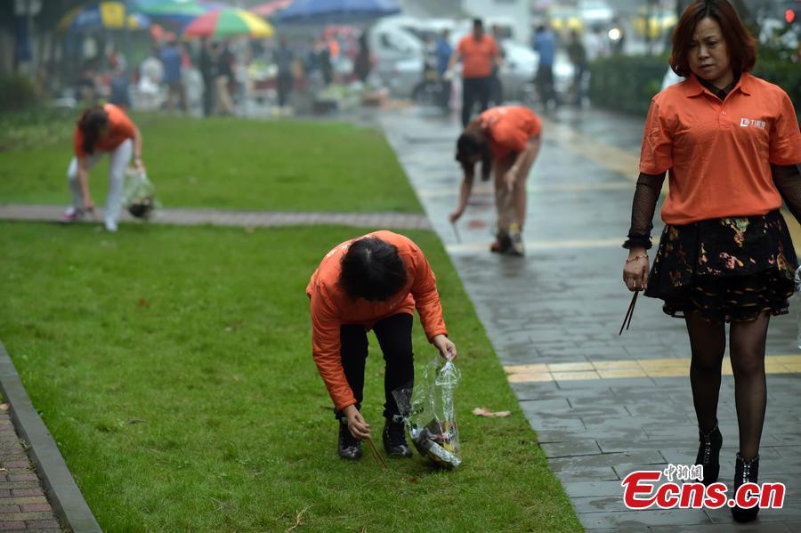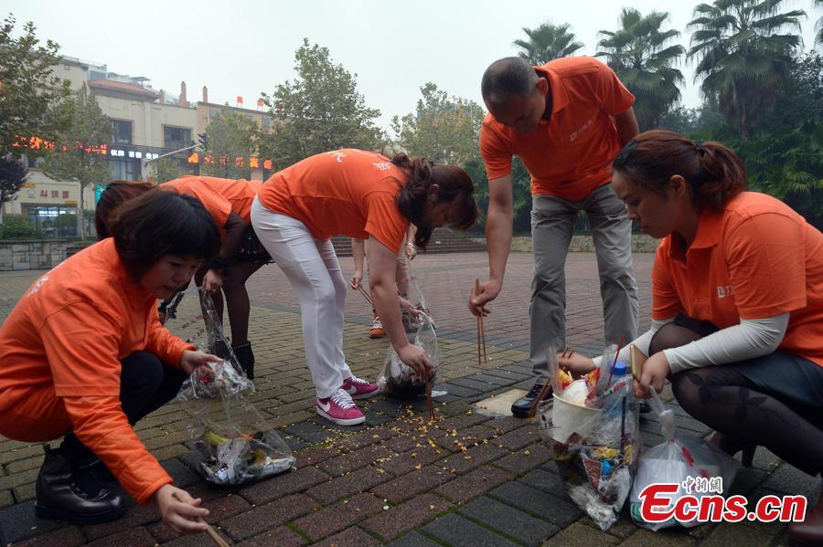Volunteers in orange shirts pick up litter on a street in Southwest China’s Chongqing municipality on October 20, 2015. Organized by a local billionaire surnamed Zhong, those volunteers are all businessmen, and they have been doing the cleaning on a regular base in the past eight months. (Photo/CFP)