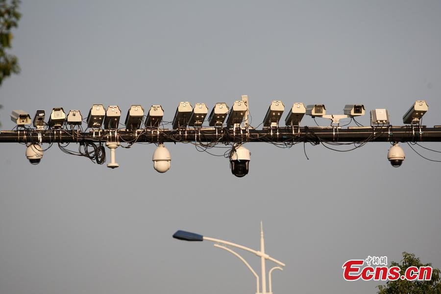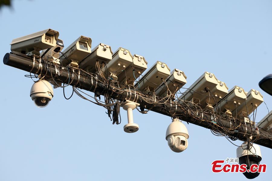 Nearly 20 cameras installed on a pole hover like sparrows over a main road of Hangzhou's Binjiang District on October 19, 2015. (Photo/CFP)