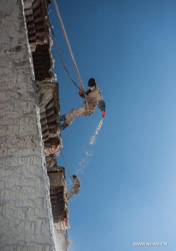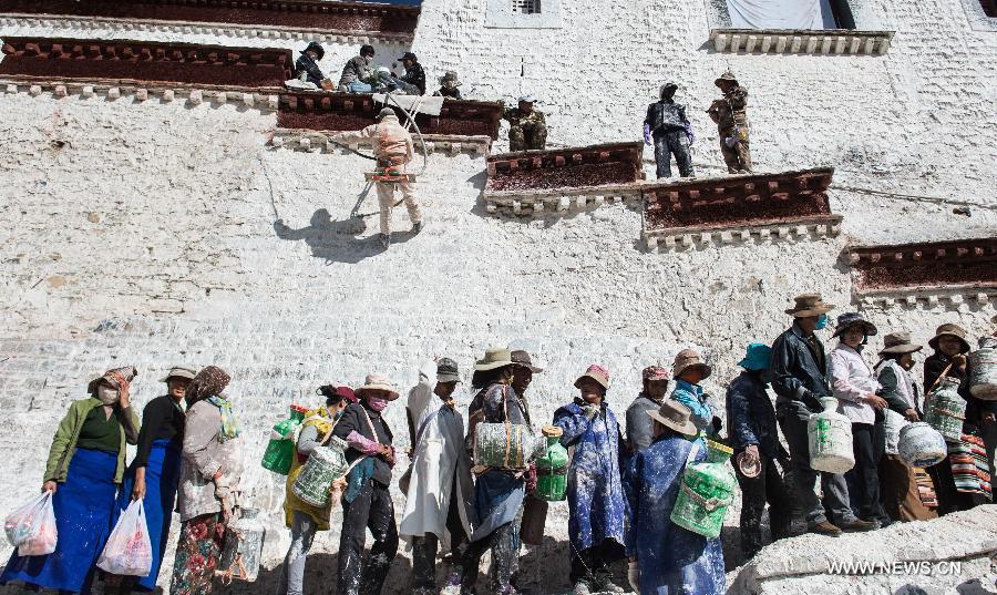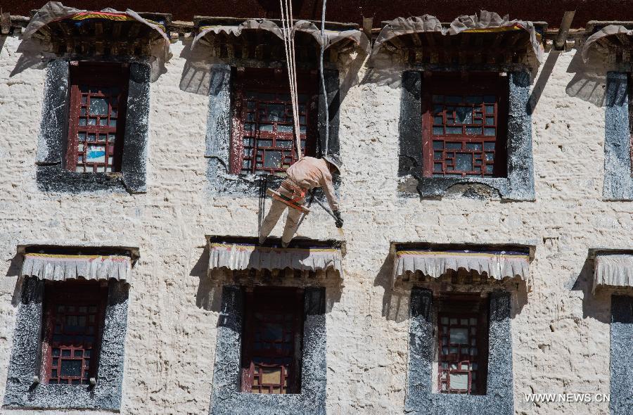 Workers repaint the Potala Palace during an annual renovation of the magnificent ancient architectural complex in Lhasa, capital of southwest China's Tibet Autonomous Region, Oct. 21, 2015. (Photo: Xinhua/Purbu Zhaxi)