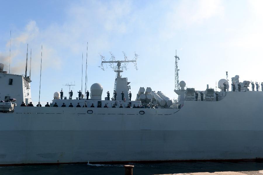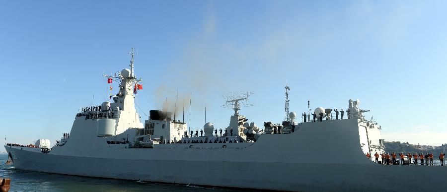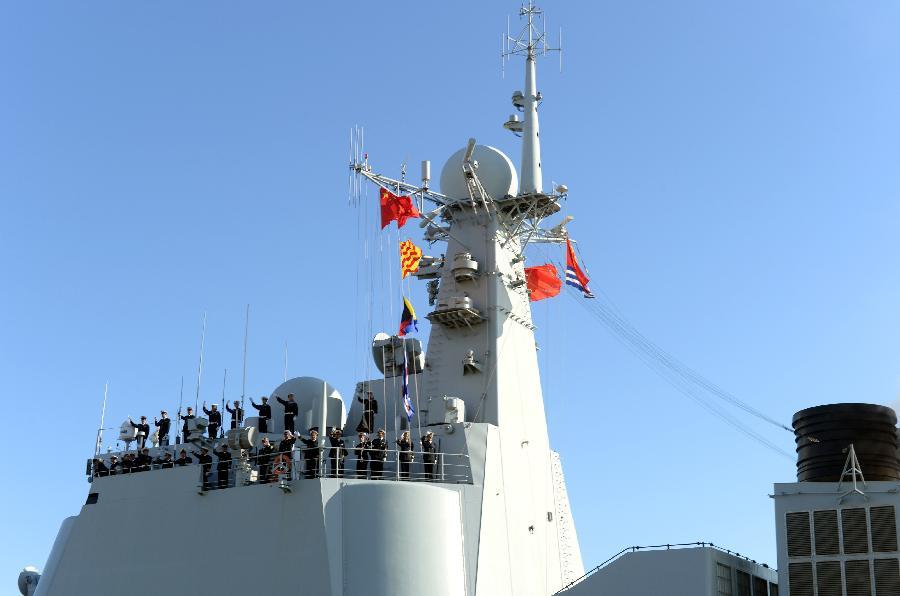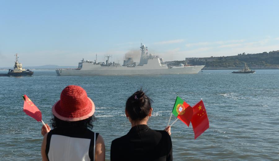 Officers and soldiers on Chinese naval missile destroyer Jinan farewell to the crowd at the departure of Chinese navy fleet in Lisbon, Portugal, Oct. 21, 2015. Chinese navy fleet 152 set off to sea Wednesday from Lisbon, after winding up its five-day visit to the country. (Photo: Xinhua/Zhang Liyun)