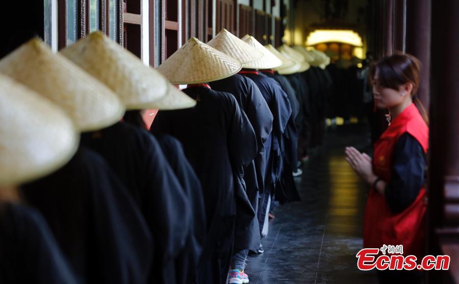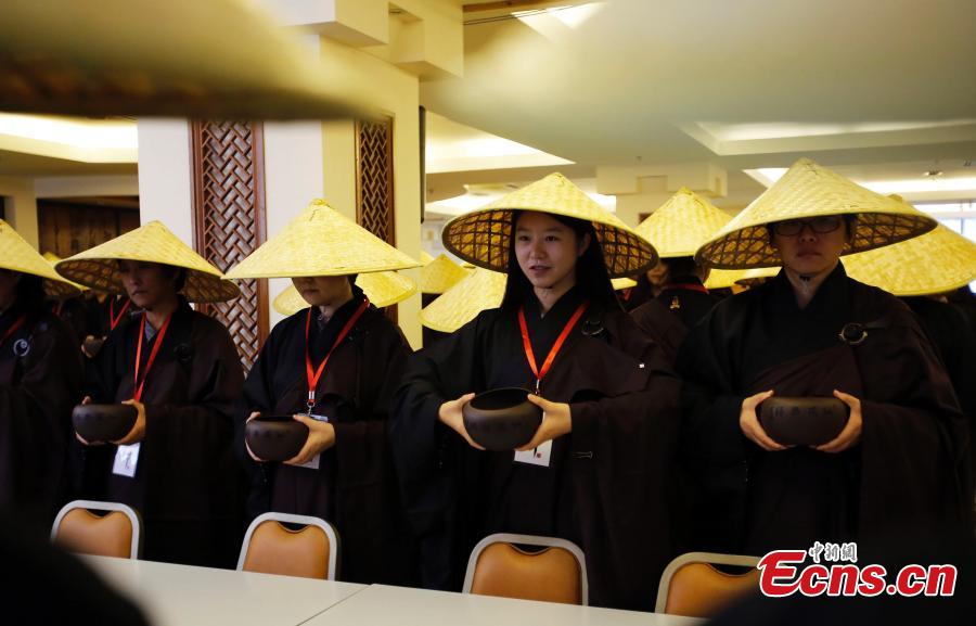 Devotees become supplicants and hold up wooden bowls in the hope of an offering of fruit during an activity on the last day of their weeklong retreat at Shanghai’s Jade Buddha Temple, October 21, 2015. The seven-day Zen class was designed to help participates to regain their spiritual balance in a hectic modern world. (Photo: China News Service/ Tang Yanjun)