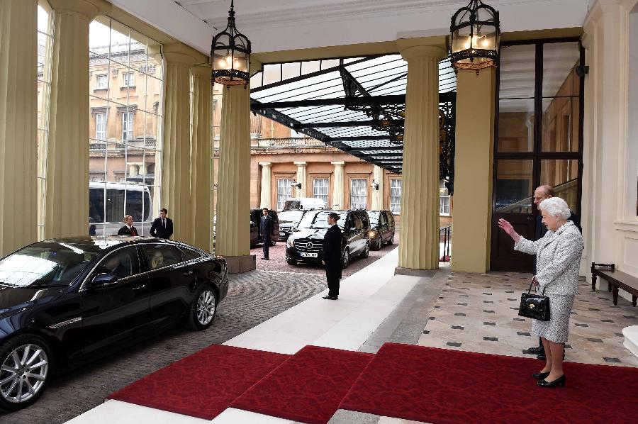Chinese President Xi Jinping (R, front) and his wife Peng Liyuan bid farewell to British Queen Elizabeth II (L, front) and her husband Prince Philip, Duke of Edinburgh, at Buckingham Palace in London, Britain, Oct. 22, 2015. (Photo: Xinhua/Ju Peng)