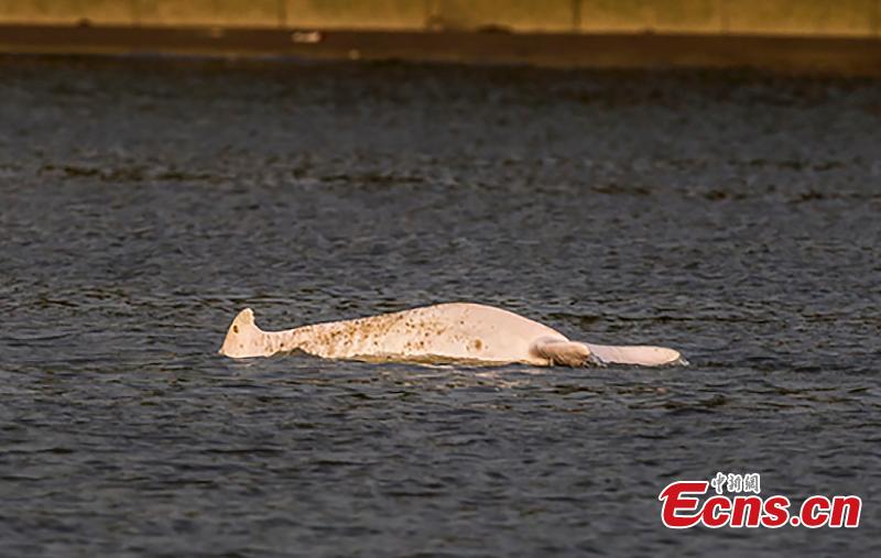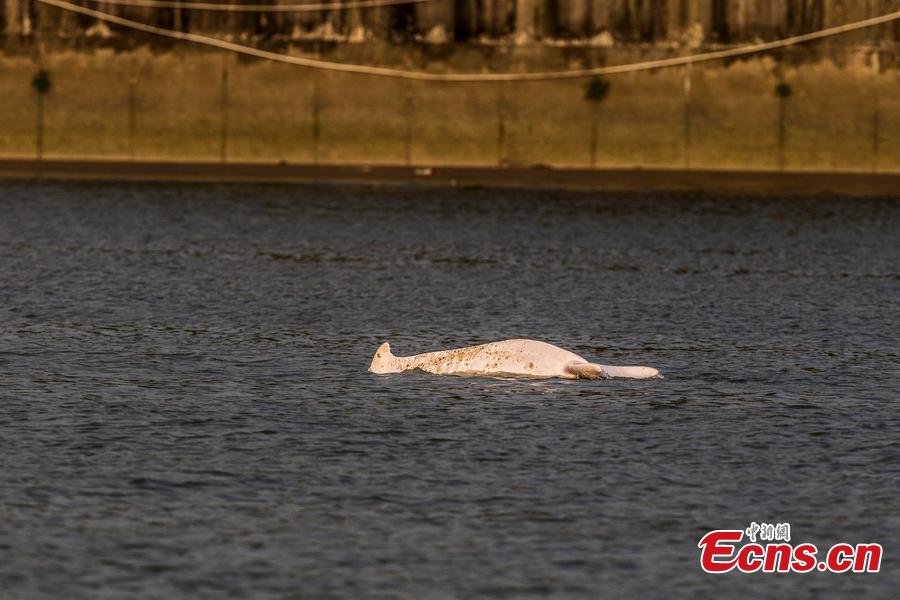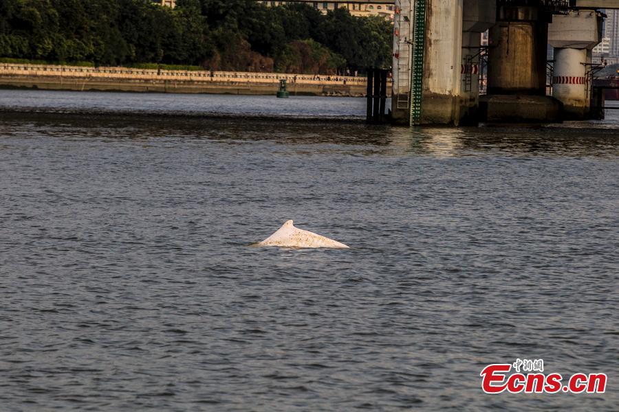 A white-flag dolphin is seen in Pearl River at Fangcun ferry in Guangzhou, South China’s Guangdong province on October 21, 2015. The dolphin swam in the river area for nearly two hours before it disappeared in water. The white-flag dolphin, another rare species of freshwater mammal in the Yangtze River, was proclaimed "functionally extinct" in 2006 because the population was too small for the species to reproduce effectively. The rare dolphin is listed as one of the 12 most endangered species in the world. (Photo/CFP)