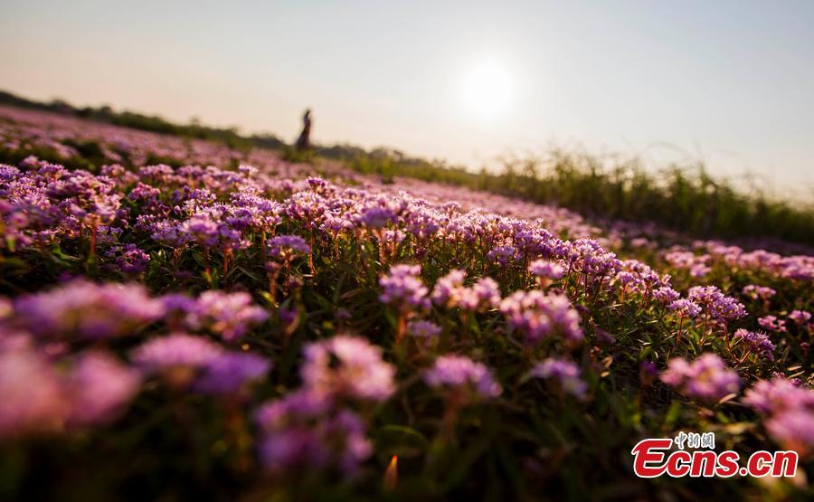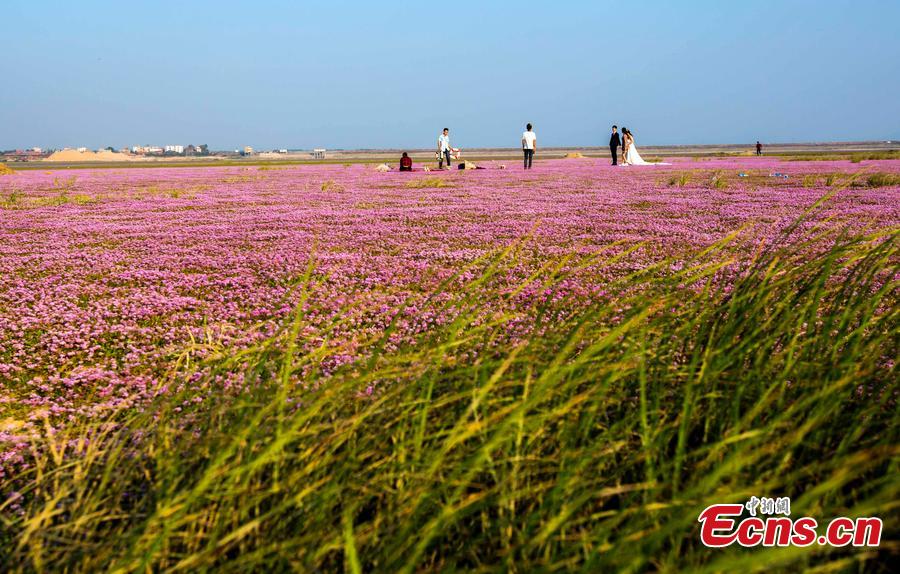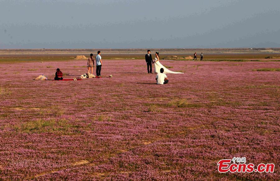 A couple takes wedding photos on dry waterbed of Poyang Lake in Changdu county, East China’s Jiangxi province on October 21, 2015. The bottom of Poyang Lake now is filled with knotweed flowers. The section of the lake entered its dry season 17 days earlier than previous years because of less precipitation. Poyang is the largest freshwater lake in China. (Photo/ CFP)